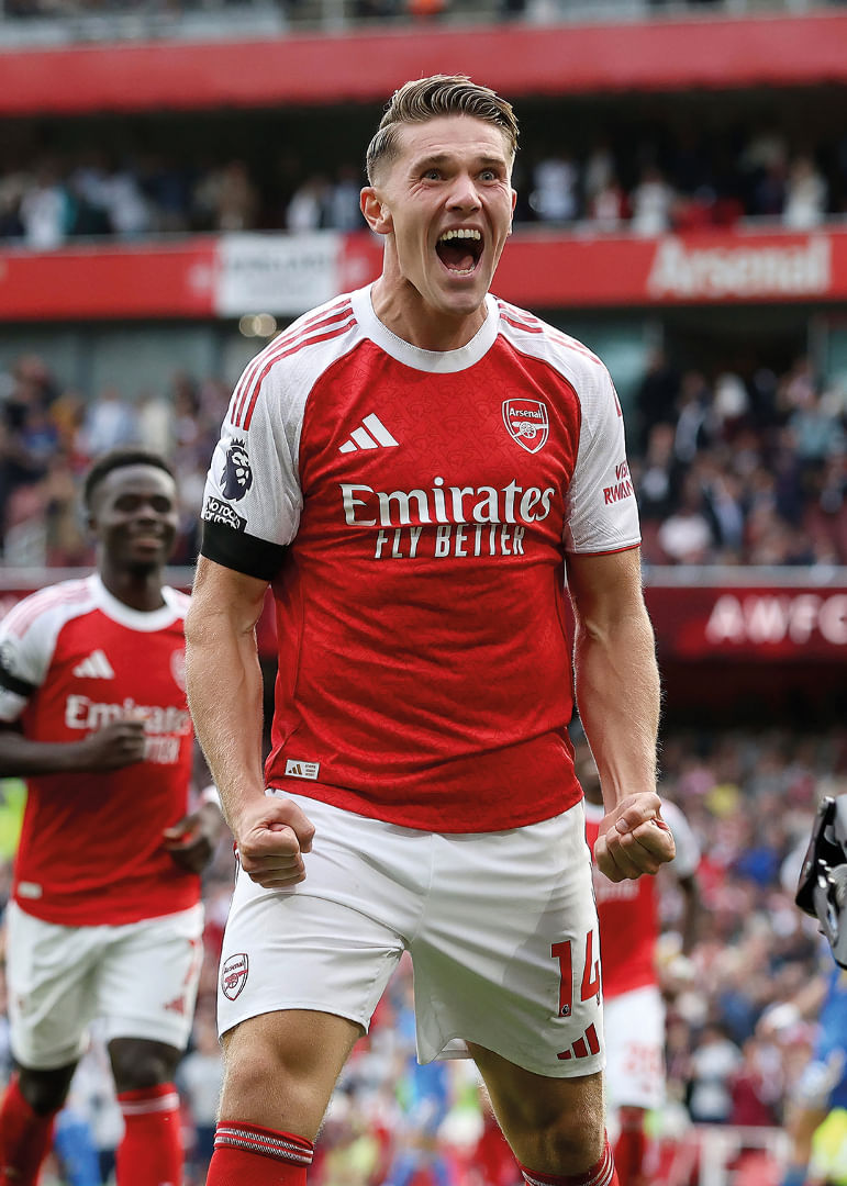 Swedish national team player Viktor Gyökeres Arsenal celebrates his first goal for Arsenal during the Premier League match against Leeds on August 23, 2025 in London.