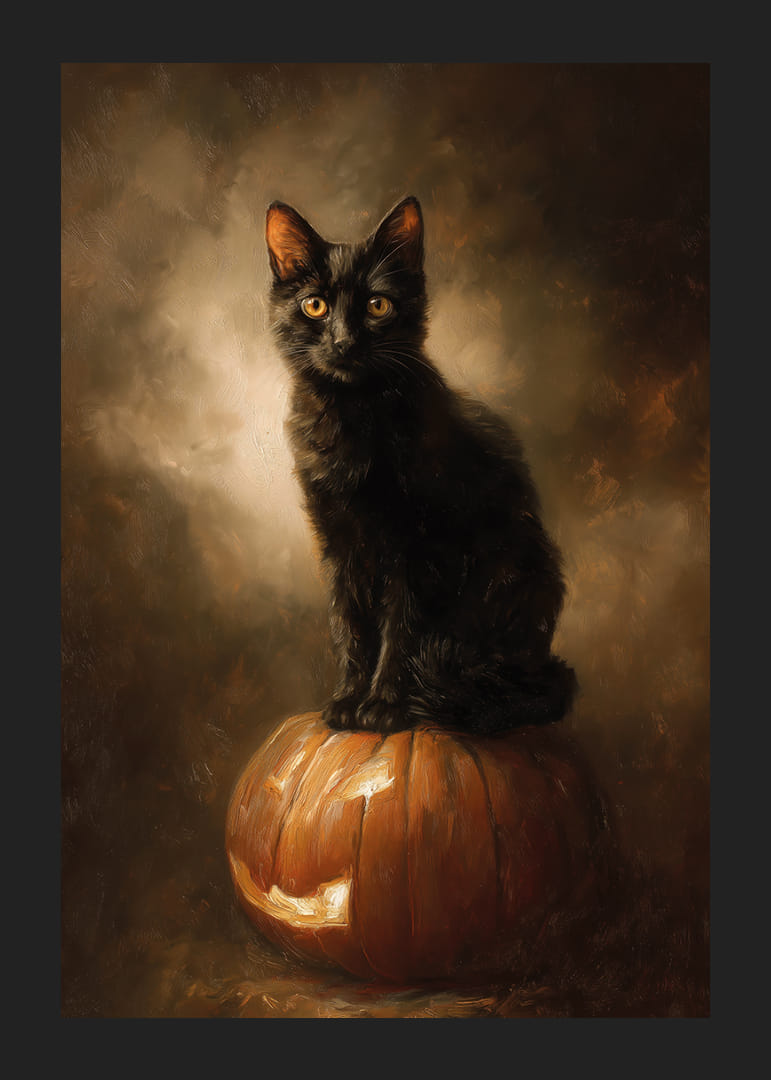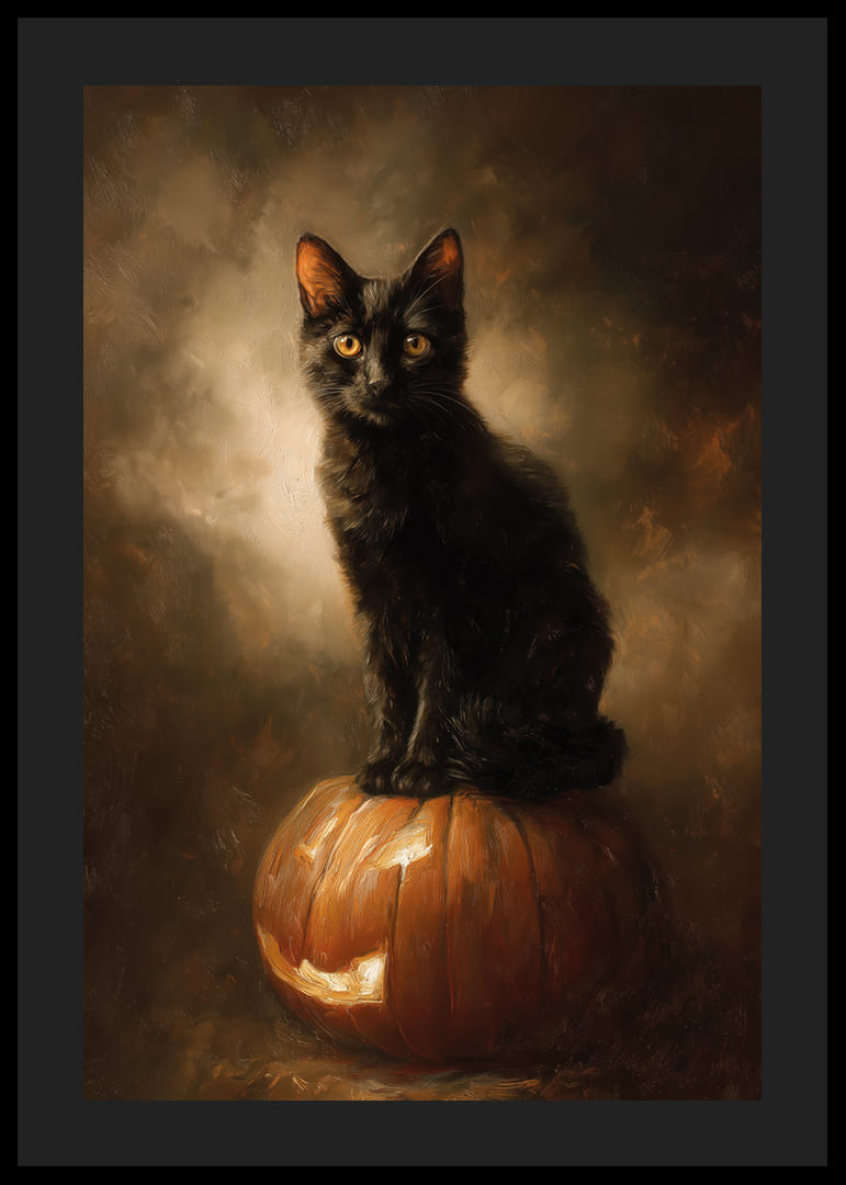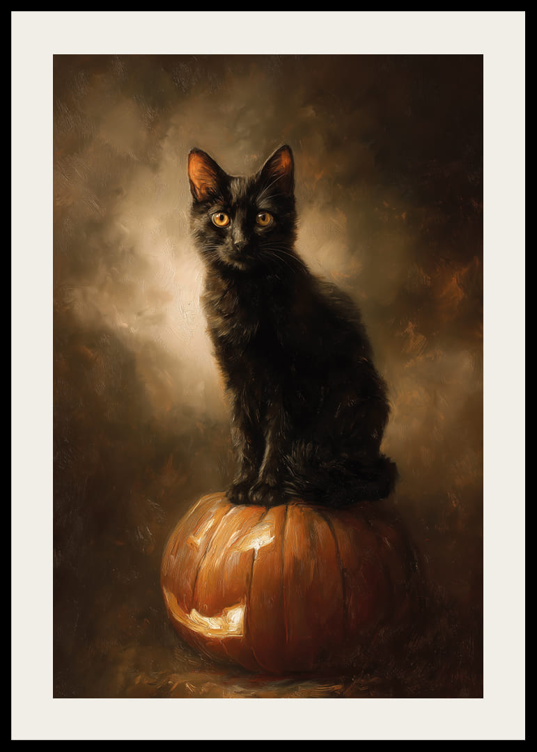 This poster captures the magic of a black cat perched proudly on a pumpkin, bathed in a golden glow that highlights its glowing eyes. With its detailed brushstrokes, it conveys a sense of mystery and elegance, perfect for the autumn mood. This poster creates an enchanting atmosphere in the home, making it a great addition to enhance the charm and elegance of your living room.