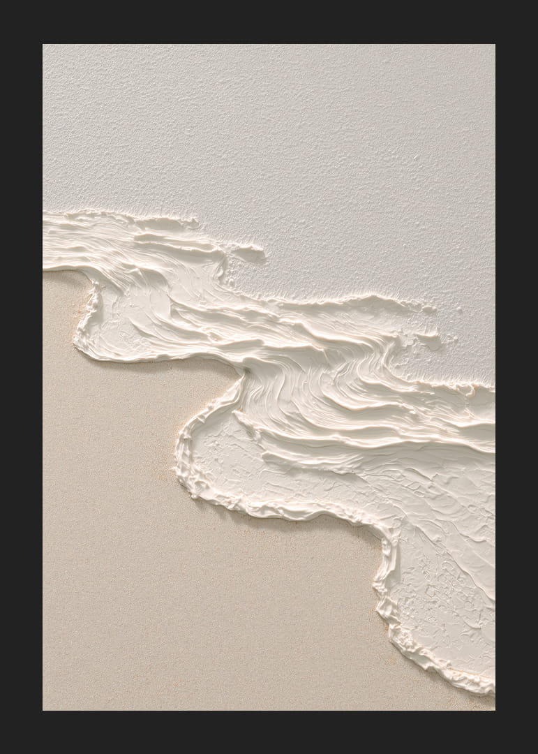 This poster captures an elegant and serene composition of textures, where each brushstroke resembles gentle waves meeting a calm shore. The color tones of creamy white and beige create a calming and harmonious atmosphere. By integrating this poster into your home, you will gain a sense of sophisticated simplicity that brings a peaceful calm and balances any modern room with a sense of natural beauty.