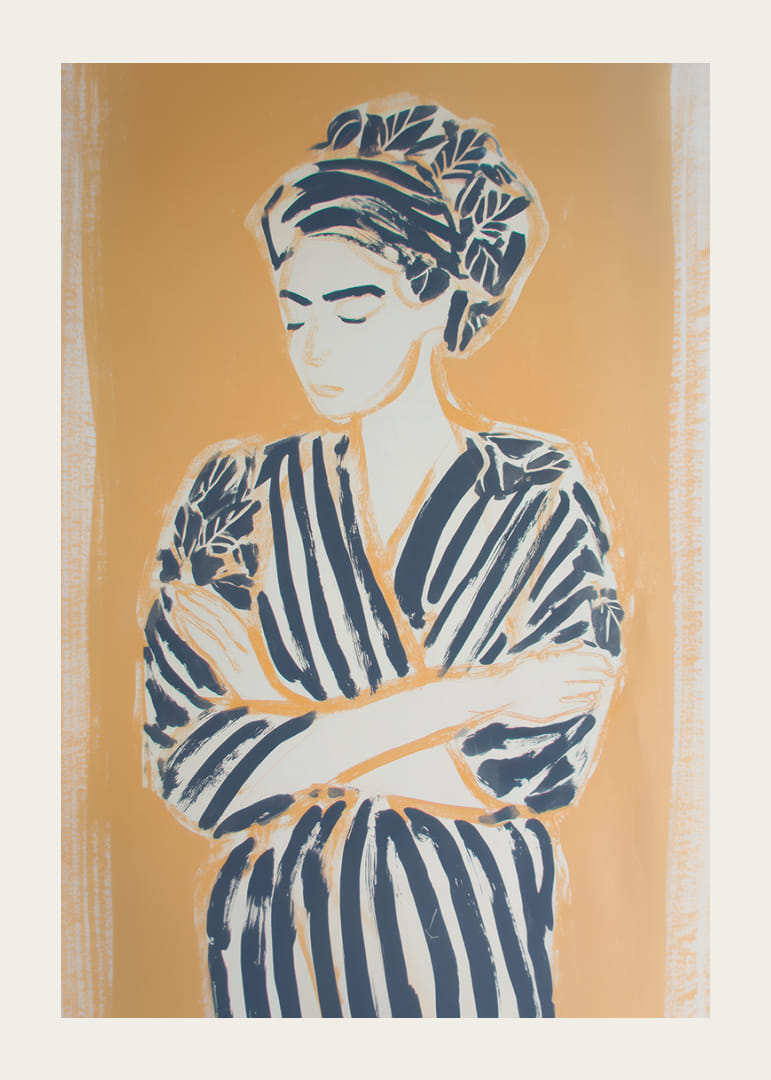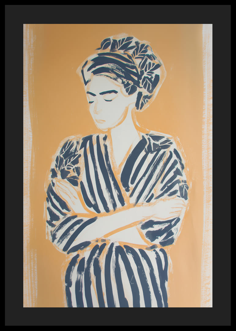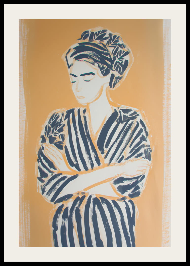 Initiate a sense of calm with this poster of a woman wrapped in relaxed lines of warm, golden tones. Her closed eyes and soft expression evoke a peaceful calm, while the bold lines of her attire create a sense of strength amidst the stillness. This poster transforms your space with a subtle balance of power and peace, creating a place for meditation and reflection.