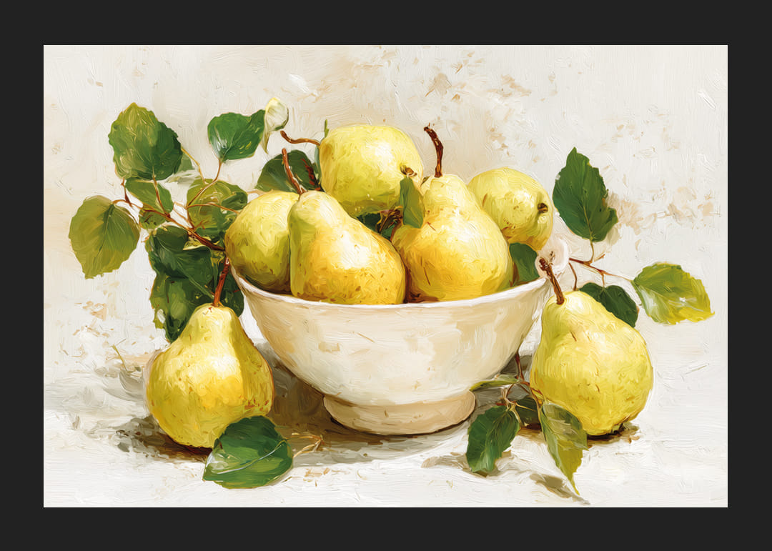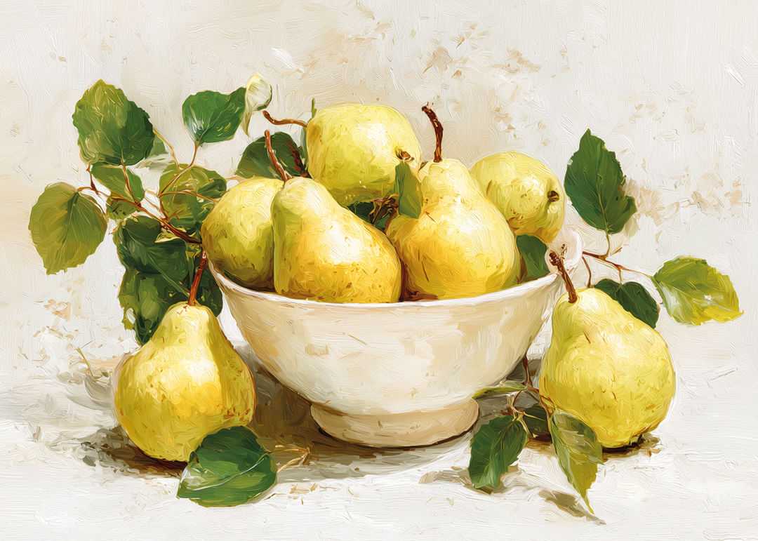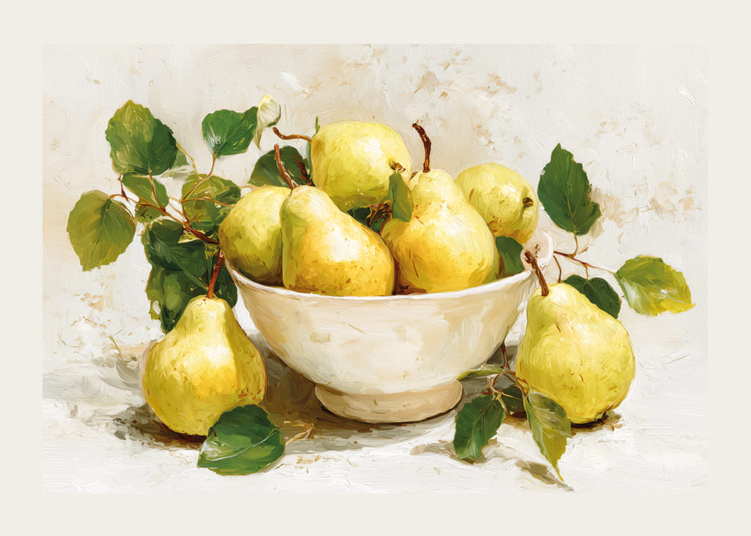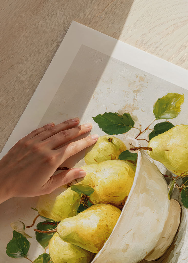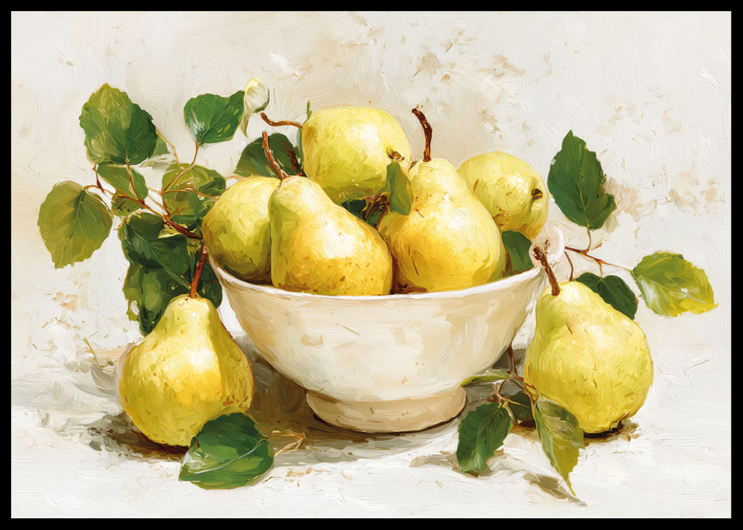 A rich sense of nature's abundance radiates from this poster featuring golden pears arranged in an elegant bowl. The surface of each pear catches the light and is complemented by the green tones of the leaves, giving an organic and harmonious feel. This poster enhances the room with its peaceful and earthy aesthetic, creating a warm and inviting atmosphere where the beauty of nature takes center stage.