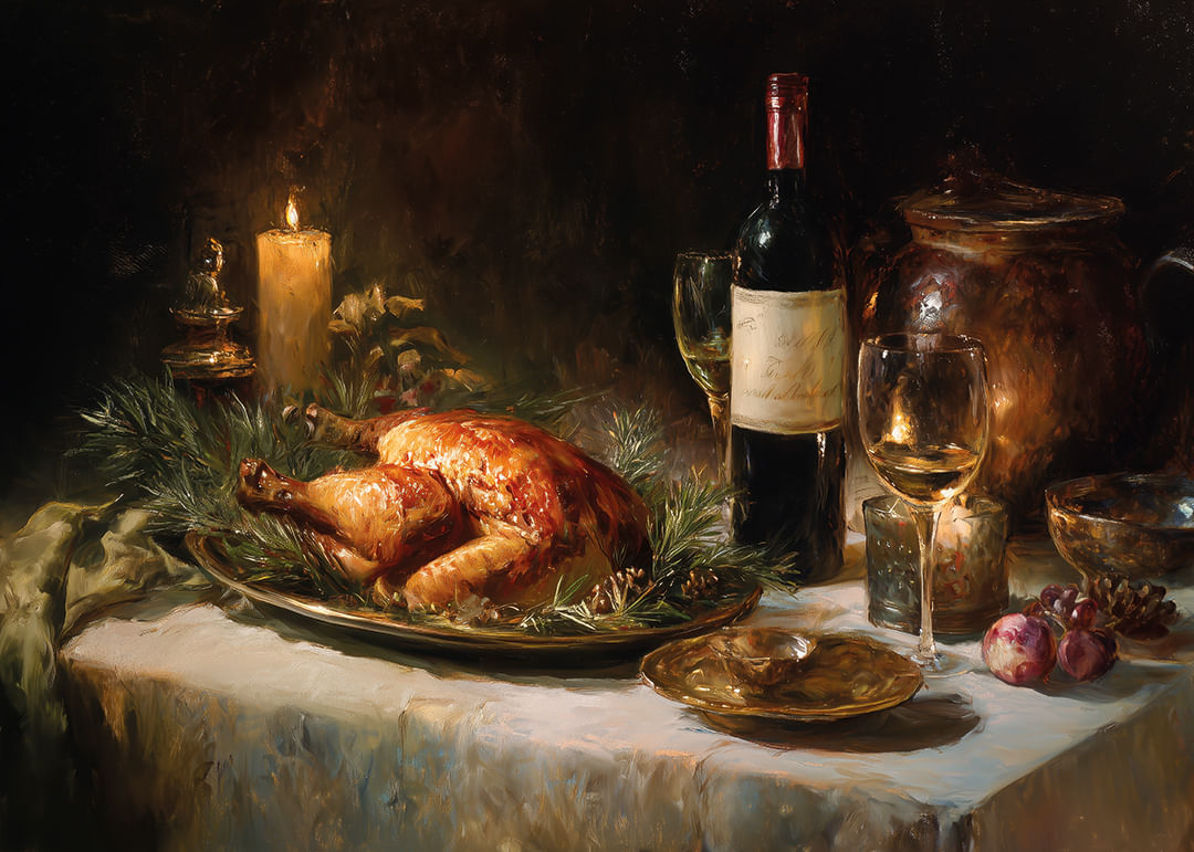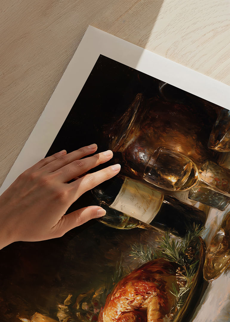 This poster captures a timeless feast with a golden roast as the centerpiece, surrounded by wine and lit candles that bring warmth to any room. The muted tones and play of light create an elegant and inviting atmosphere, perfect for enhancing the aesthetics of the dining room. With this poster, you can almost smell the aromas and hear the conversations at the table, a celebration of both taste and style.