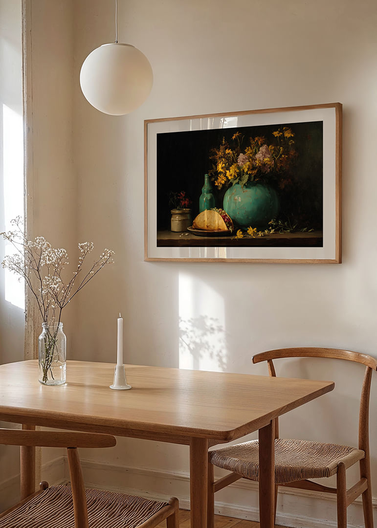 This poster captures the essence of country charm with a fascinating blend of floral splendor and culinary delights. The colors of the floral arrangement contrast beautifully with the rustic feel of the room. The poster exudes a warm and inviting atmosphere, perfect for enhancing the feel of any kitchen or living room. The vibrant scene adds a colorful and lively dimension.