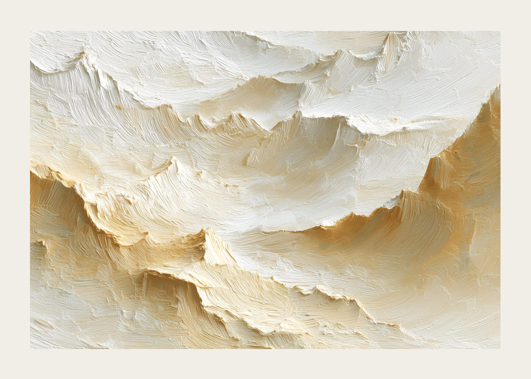 This poster catches the eye with its soft, creamy colors and shimmering waves of yellow that sweep across the canvas. The textures create a hypnotic depth effect that gives a sense of peace and tranquility. This artwork, with its subtle movements and harmonious tones, transforms any room into a peaceful oasis. A perfect poster to add a sense of artistic elegance to your home.