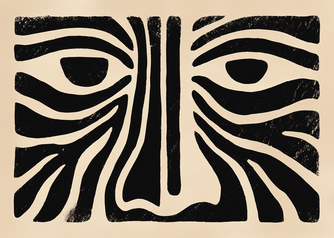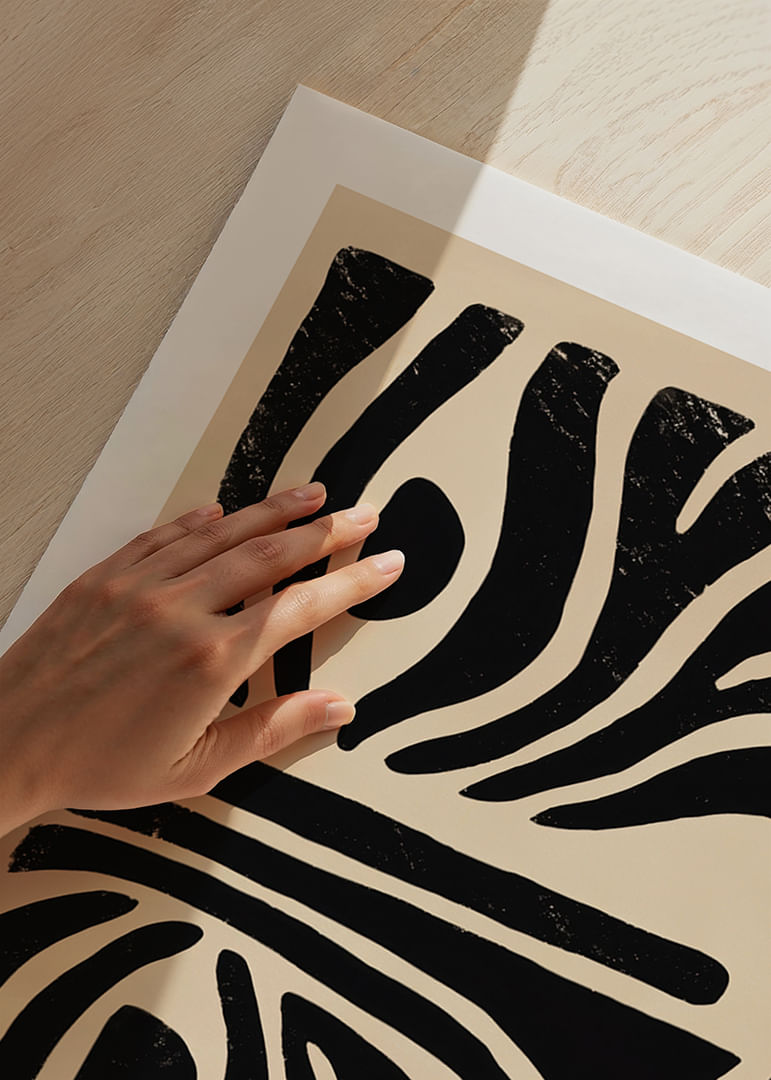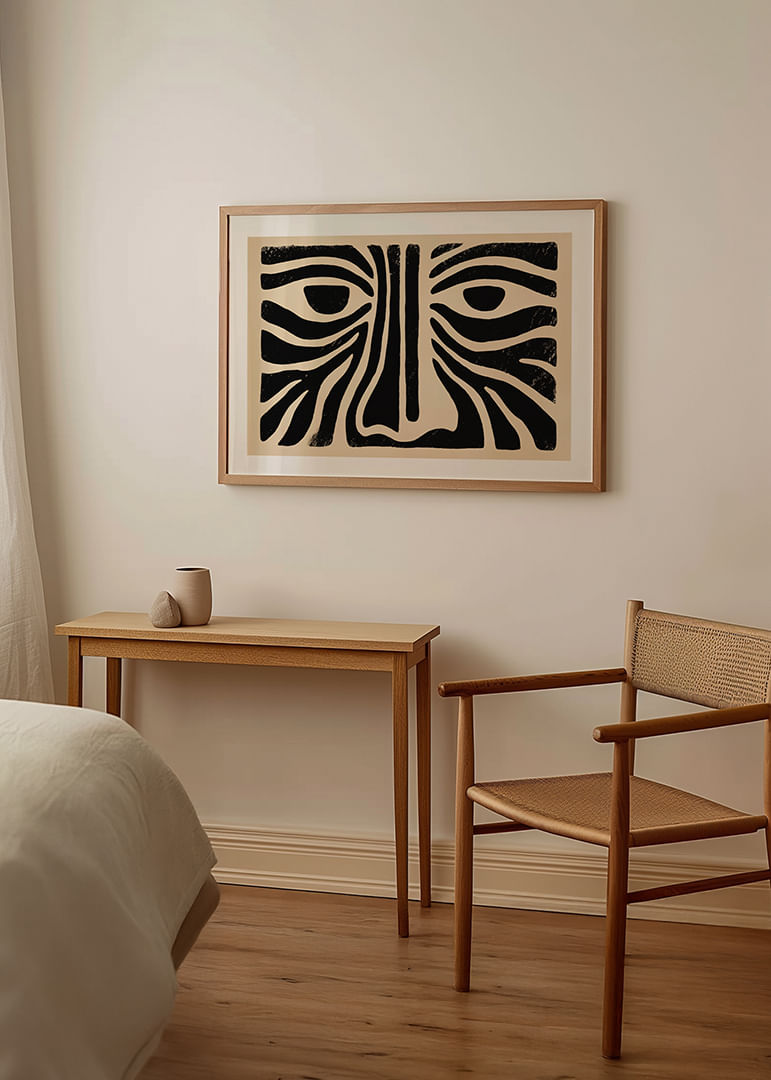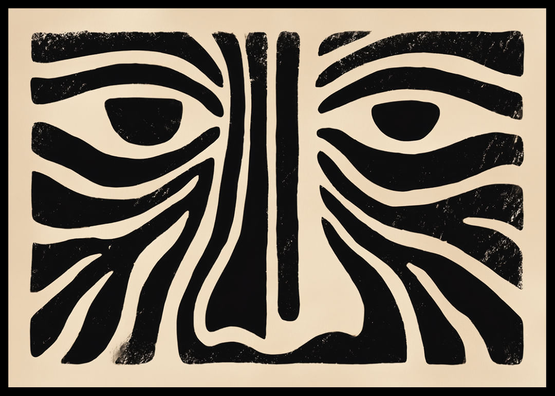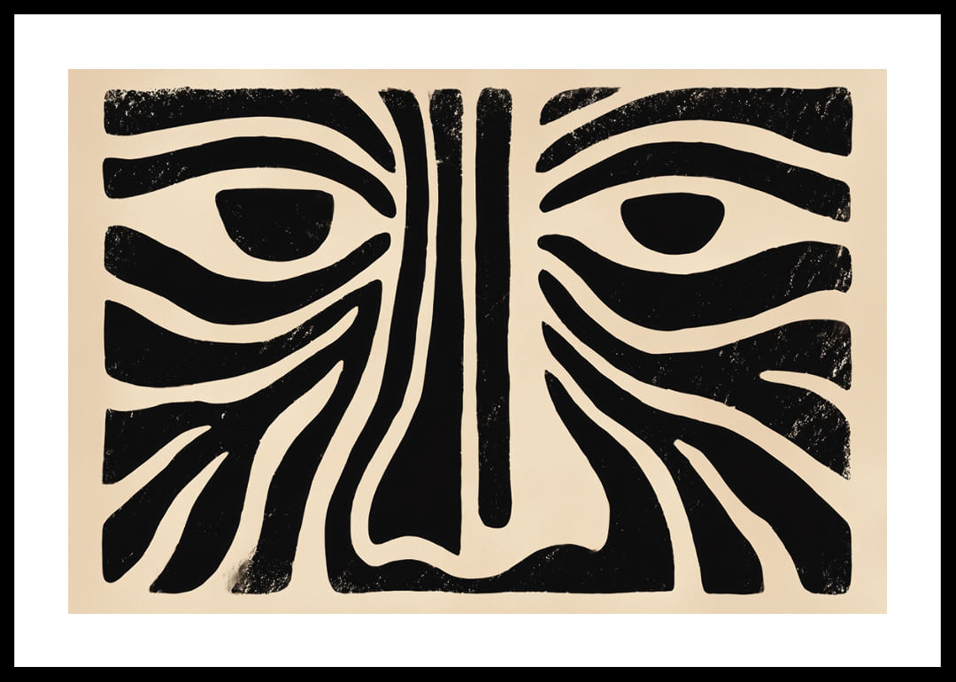 This poster exudes a magnetic attraction through its bold patterns and pairs of eyes that look into eternity. Black lines snaking across a neutral background create a dramatic contrast that is both simple and complex. The poster adds a sense of mystery and intrigue to any room it adorns, leaving an unforgettable impact on its surroundings.