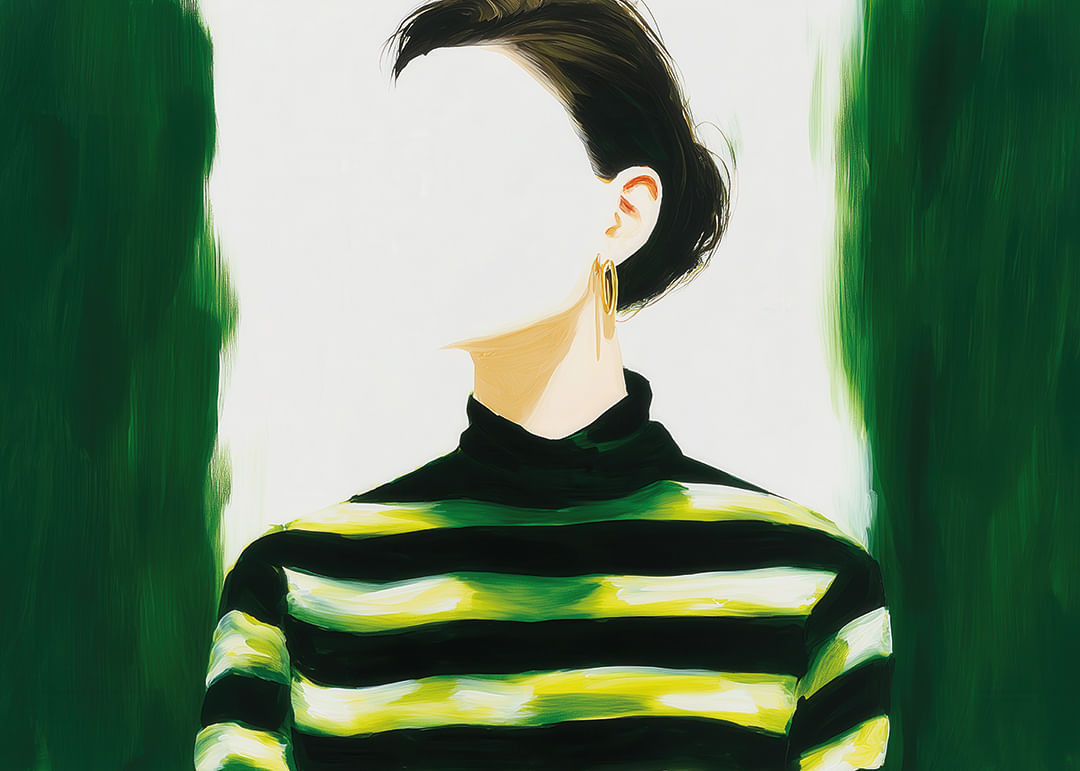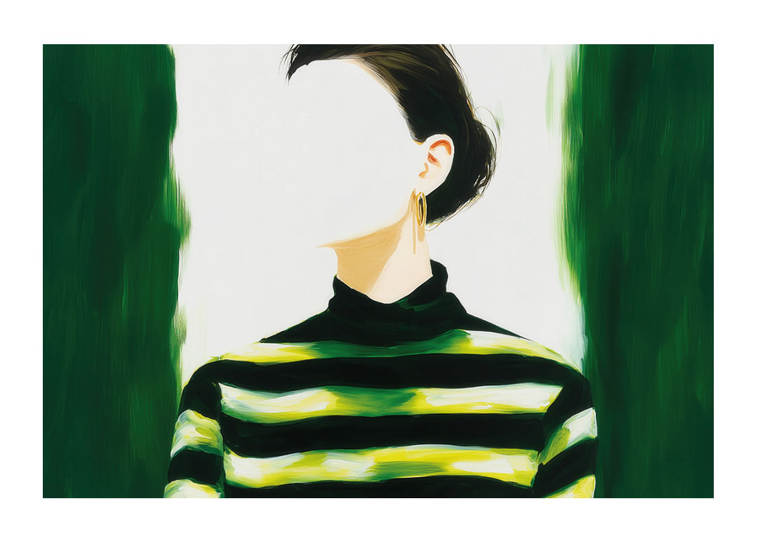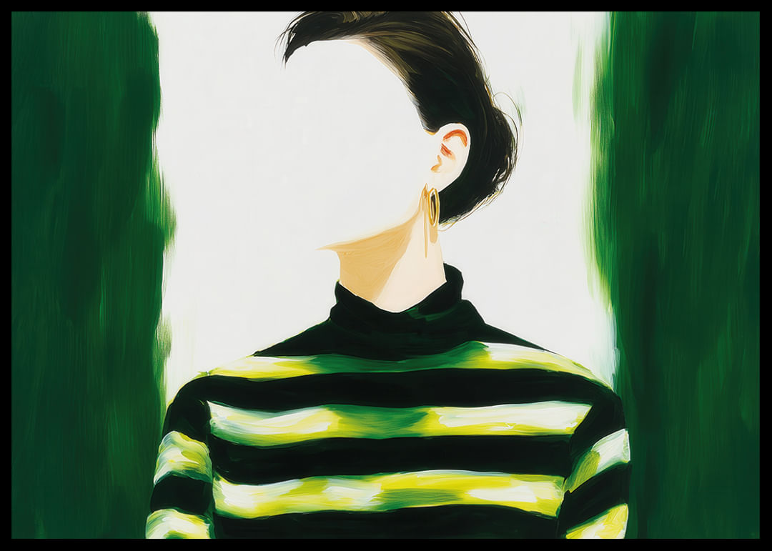This poster catches the eye with its contrasts between vibrant green and muted black. With its stylish image of a woman in a striped sweater and a face that is omitted, the poster invites the viewer's own interpretation. The minimalist expression becomes a conversation between the unspoken and the experienced, giving your home a sophisticated aura and a focus on individual expressiveness.