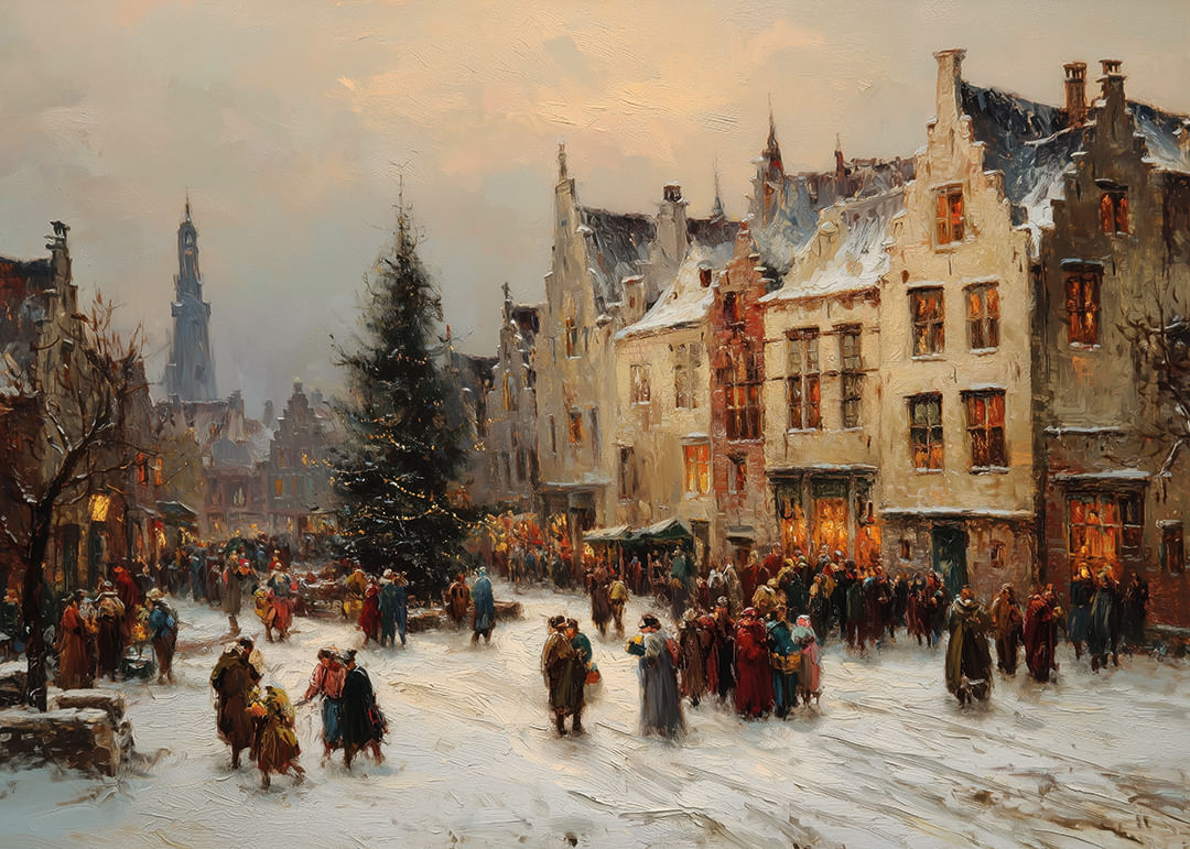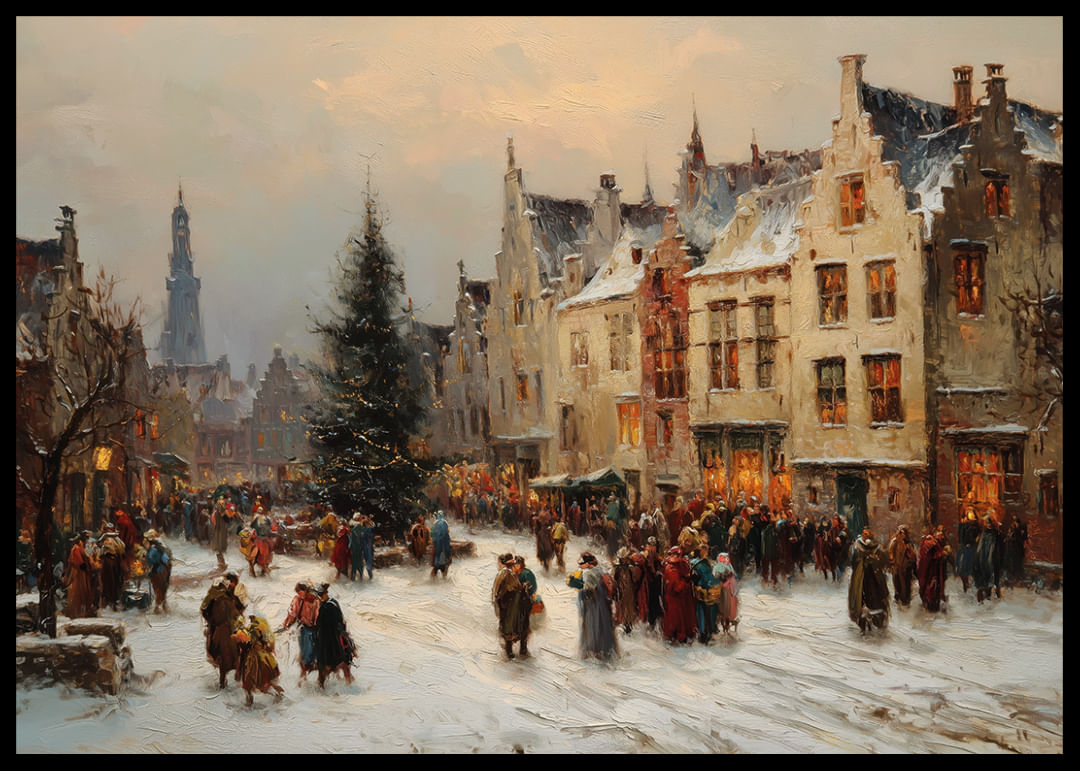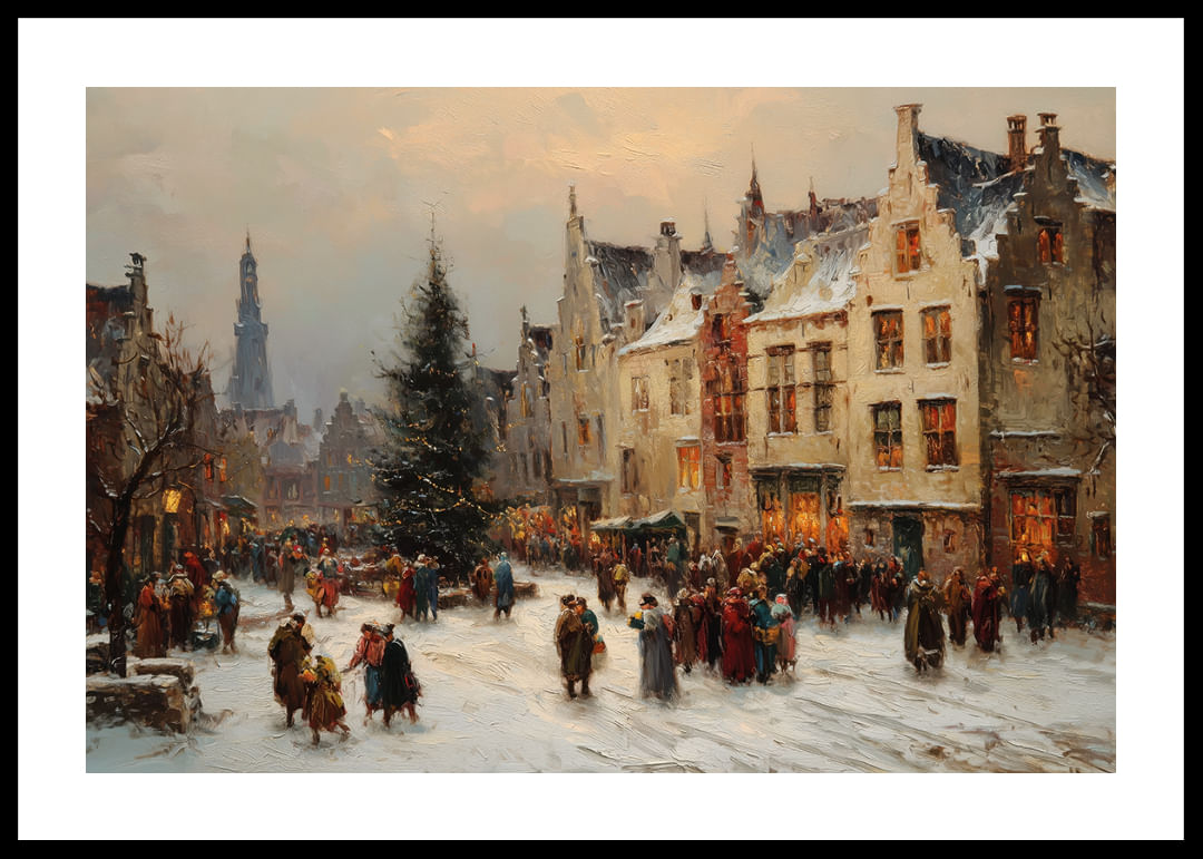 A beautiful Christmas market poster captures the winter spirit with snow-covered houses and sparkling lights. The shops and the people gathered create a cozy atmosphere of festivity and warmth. This poster conveys a sense of nostalgic charm and homeliness. It gives your home a festive touch and reminds you of the joy of winter gatherings, a perfect decoration to spread the Christmas spirit.