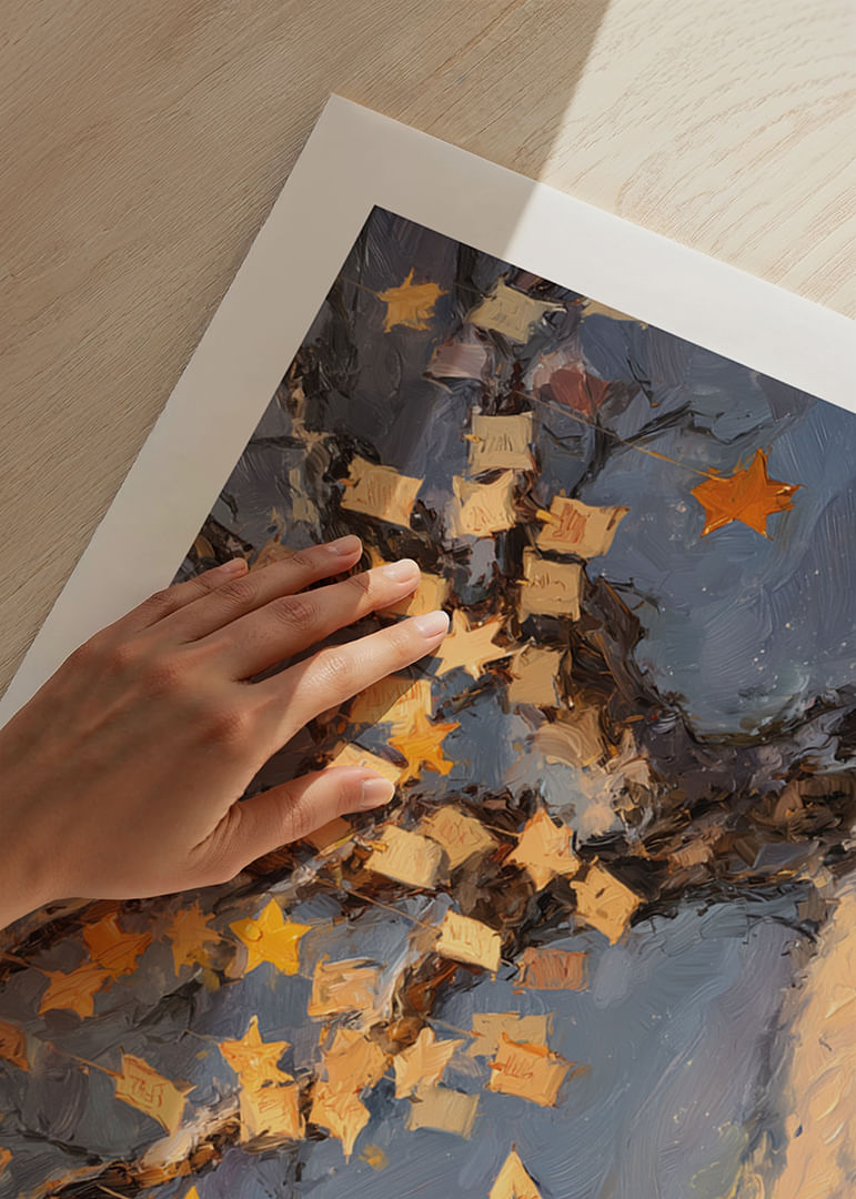 This magical poster depicts two children standing by a tree covered in shining stars and wish notes floating in the cold winter air. Their curious gazes and the snow surrounding them create an enchanting scene of childlike wonder. This poster captures the heart with its warm light and mystery, becoming a timeless detail that fills any room with magic and dreams, perfect for dreaming of starry nights.