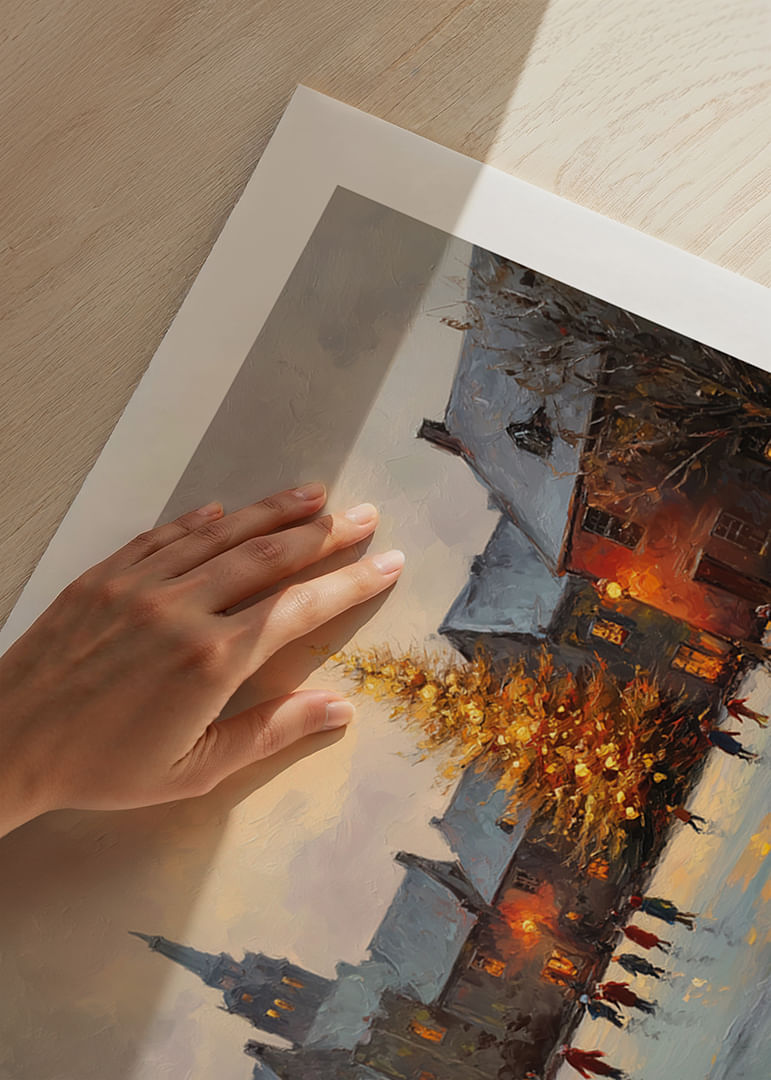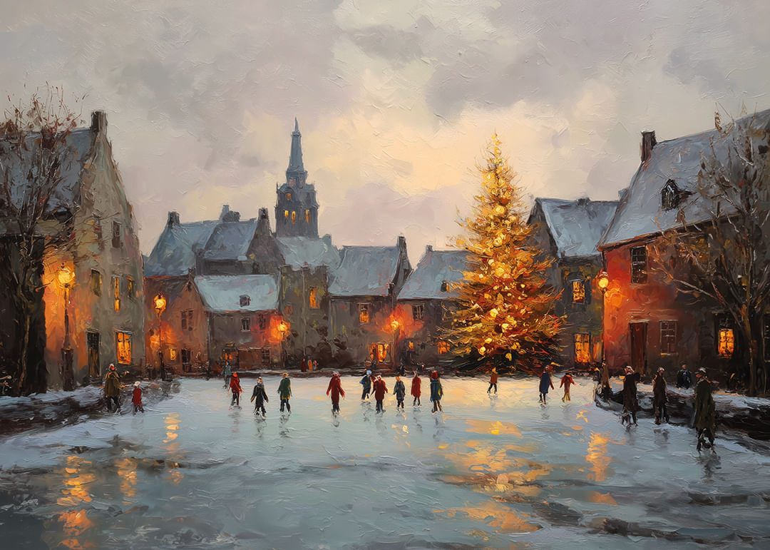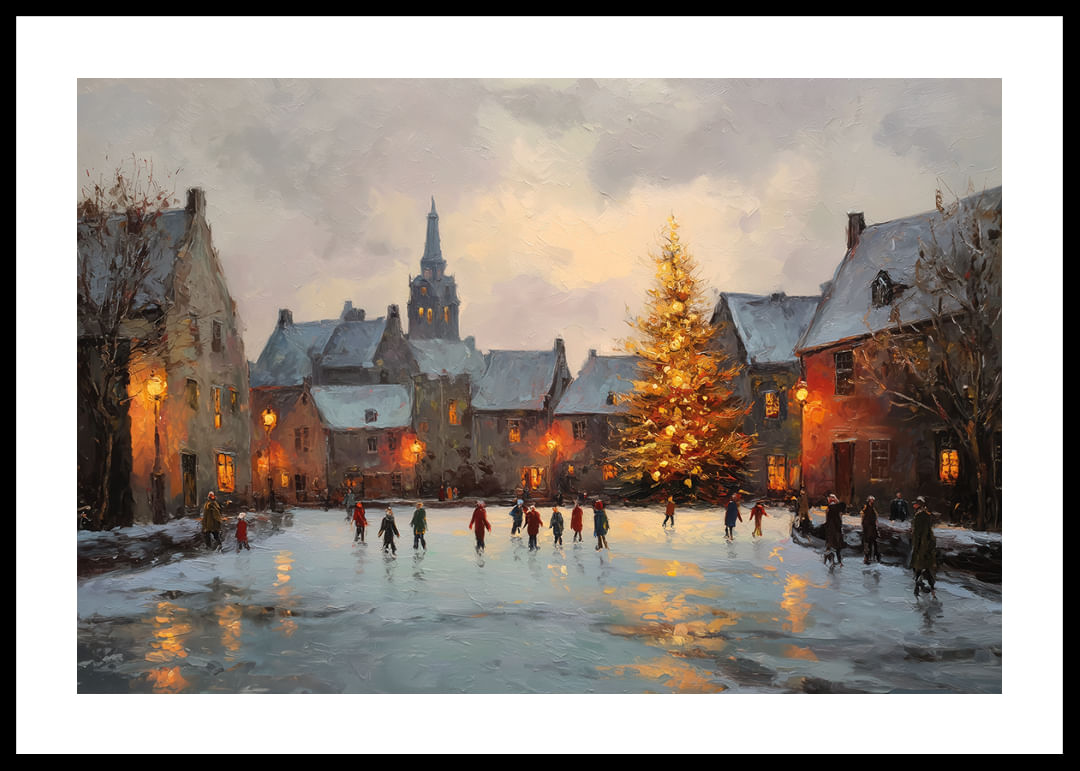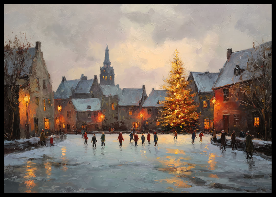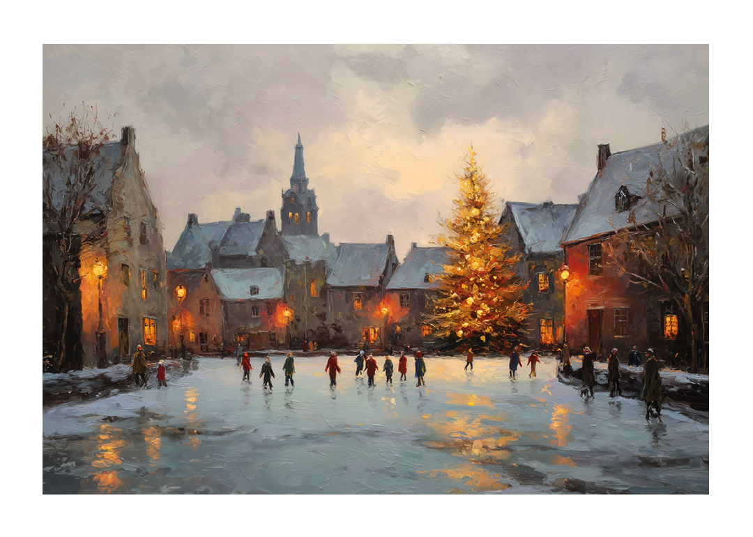 Feel the enchanting atmosphere of this poster that captures a magical evening in a picturesque village. Soft snowflakes fall as children and adults enjoy ice skating on the frozen pond, surrounded by warm Christmas lights from the Christmas tree and surrounding houses. This poster, with its soft colors and warm lights, invites a sense of community and spreads coziness in your living room.