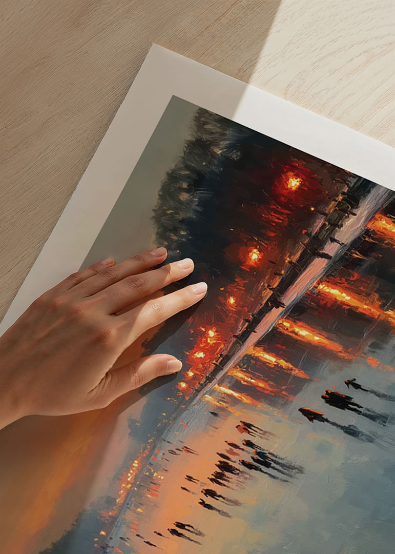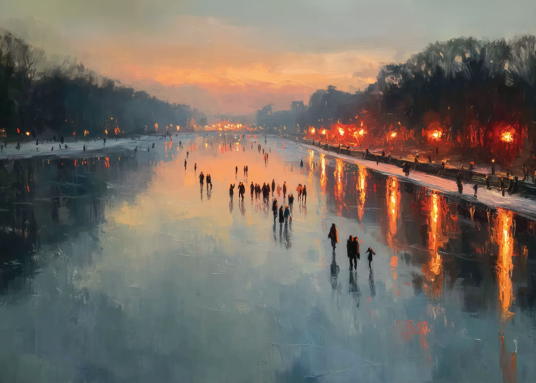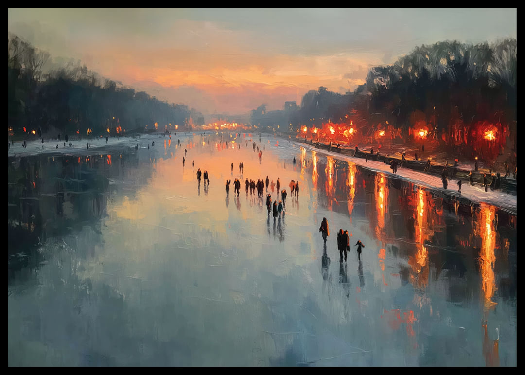 This poster captures a winter evening where people skate on a mirror-like ice while the warm light of the sunset dances across the surface. The glowing horizon is reflected in the ice, creating an enchanting atmosphere of calm and beauty. With its subtle palette and soft lighting, this poster gives the room a sense of tranquility and timeless charm, perfect for enhancing the atmosphere of your living room.