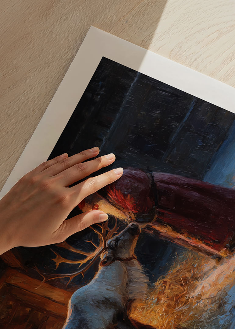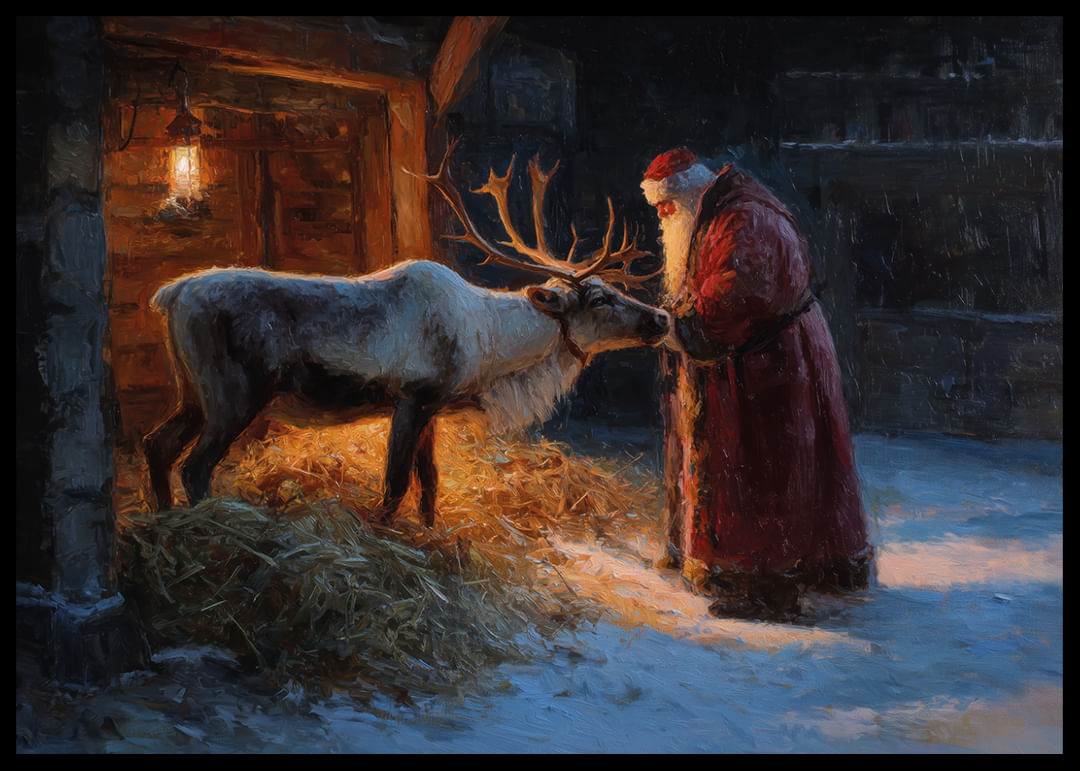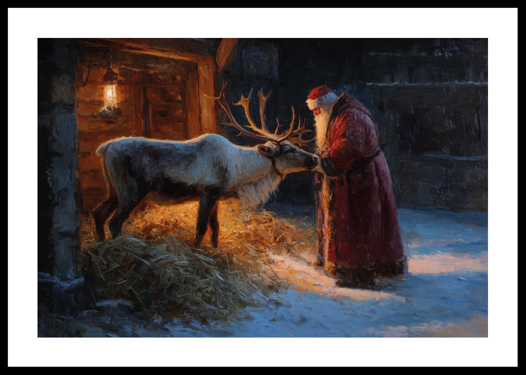 In this poster, Santa and the reindeer meet on an enchanting winter evening where snowflakes swirl. The light from the stable lantern illuminates their warm, quiet meeting, creating a sense of calm and anticipation. The deep red coat and the reindeer's majestic antlers embrace the night with dreamy beauty. This poster will transform your room into a peaceful winter oasis, where the magic of Christmas is felt in every detail.