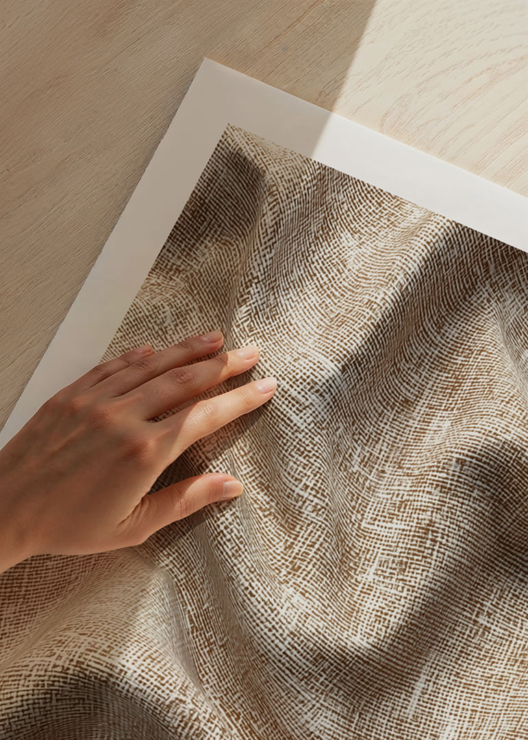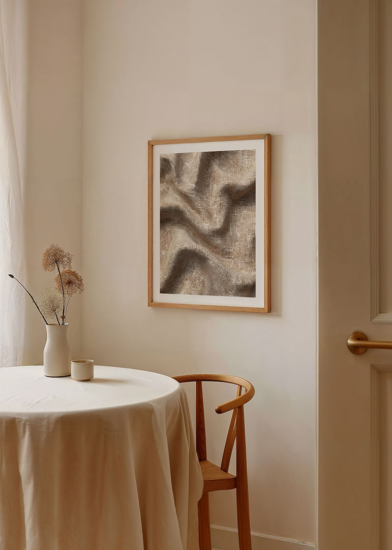 This poster catches the eye with its soft waves and earthy hues, like a quiet whisper of nature's elegance. The intricate details and woven patterns contribute to a sense of calm and harmony. The subtle color palette of the poster blends seamlessly into different environments, creating a calm and inviting atmosphere that enriches any room with a natural and stylish touch.