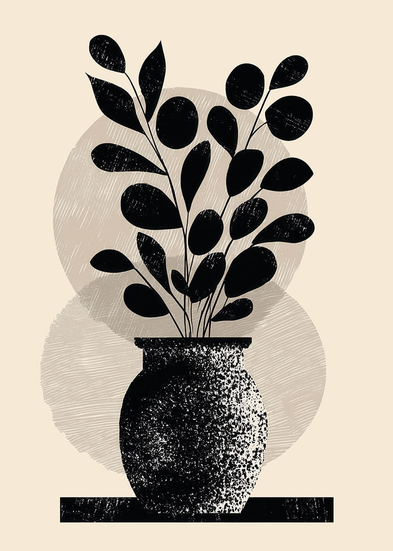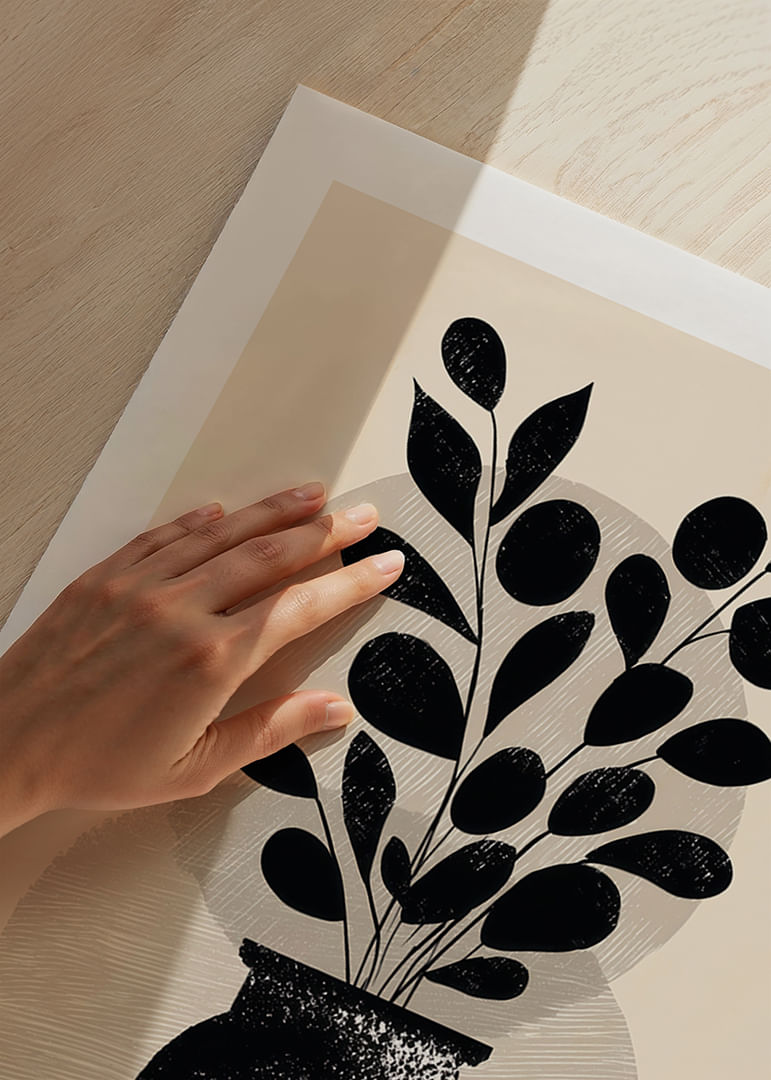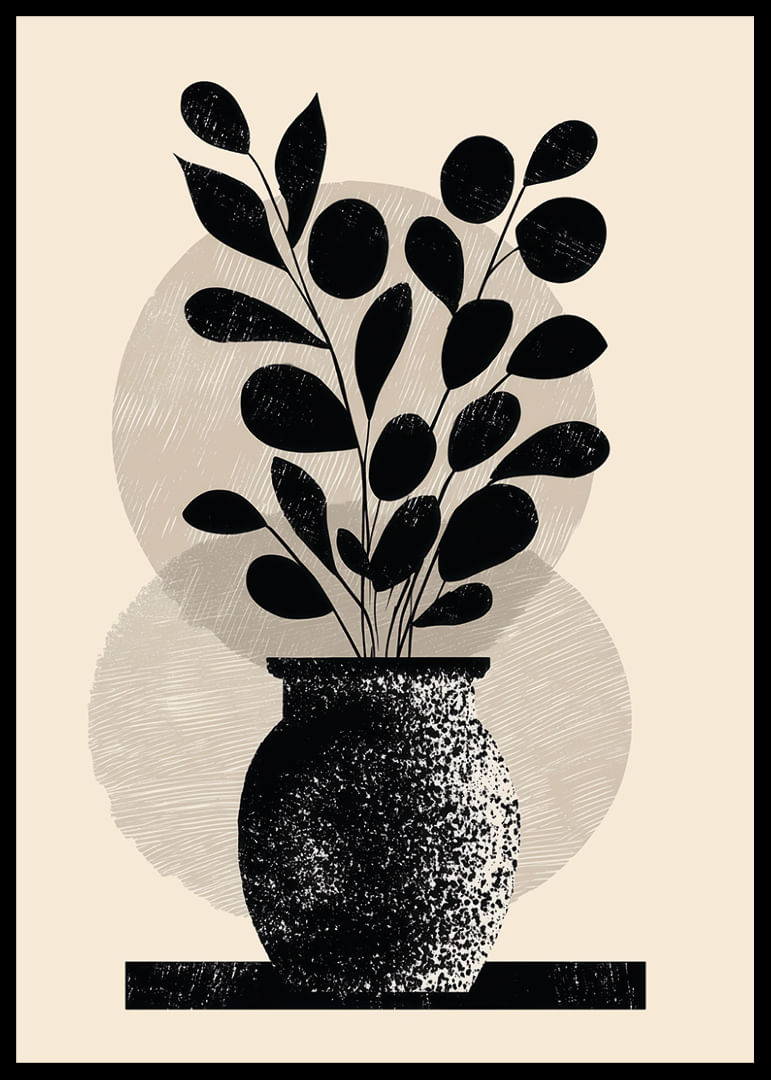 This poster showcases an elegant and timeless design with a black and white plant silhouette contrasting against a soft background. With its minimalist beauty and calming atmosphere, it adds a sophisticated touch to any wall. Perfect for creating a sense of calm and style in your home, this poster will easily transform your room into a peaceful oasis.
