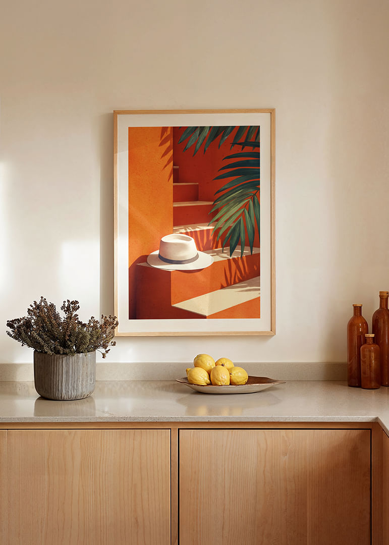 This poster captures the feeling of a sunny paradise with its vibrant orange stairs and lush green leaves. The shadows dance softly across the surface, giving a sense of peace and tranquility. The hat adds a touch of vacation and relaxation. With this poster you create an uplifting and peaceful atmosphere in your home, where every day feels like a trip to a tropical hideaway.