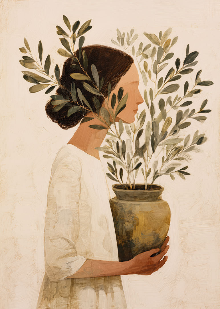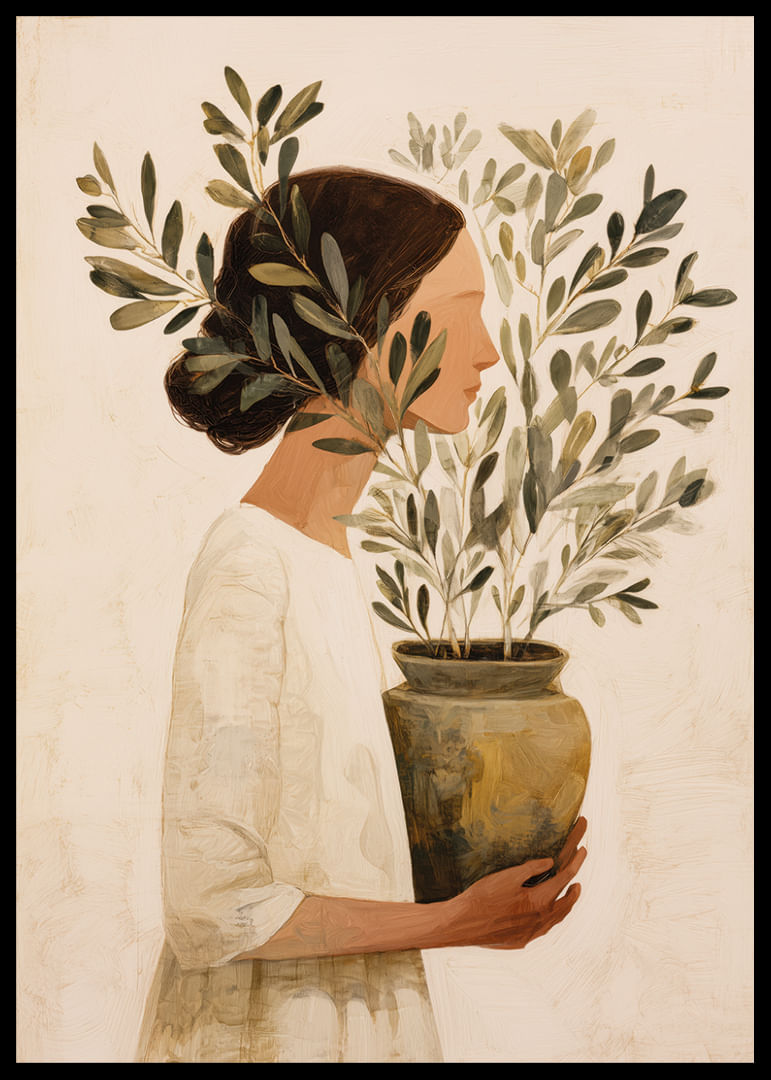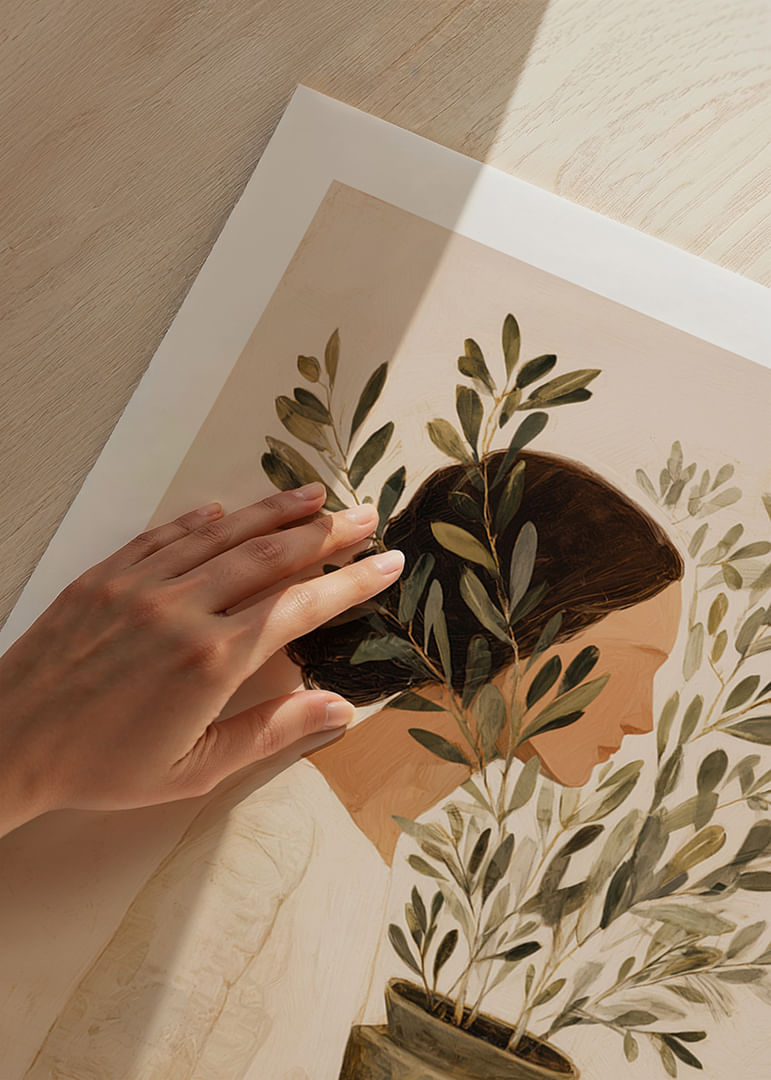 This poster captures a woman harmoniously merging with nature, surrounded by lush green leaves that seem to caress her face. The gentle color palette creates a sense of peace and tranquility, highlighting the beauty of simplicity and naturalness. By bringing the quiet elegance of nature into your home, the poster enhances the atmosphere and adds a sense of timeless harmony and peace.