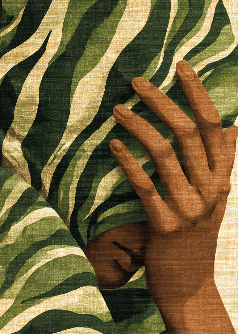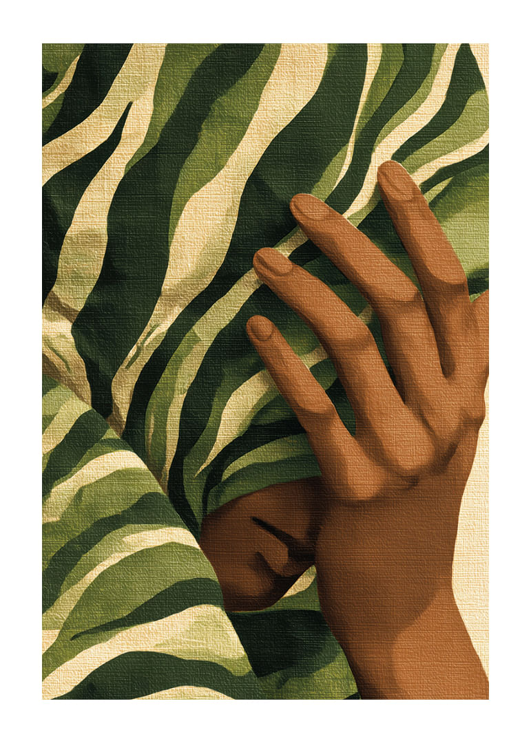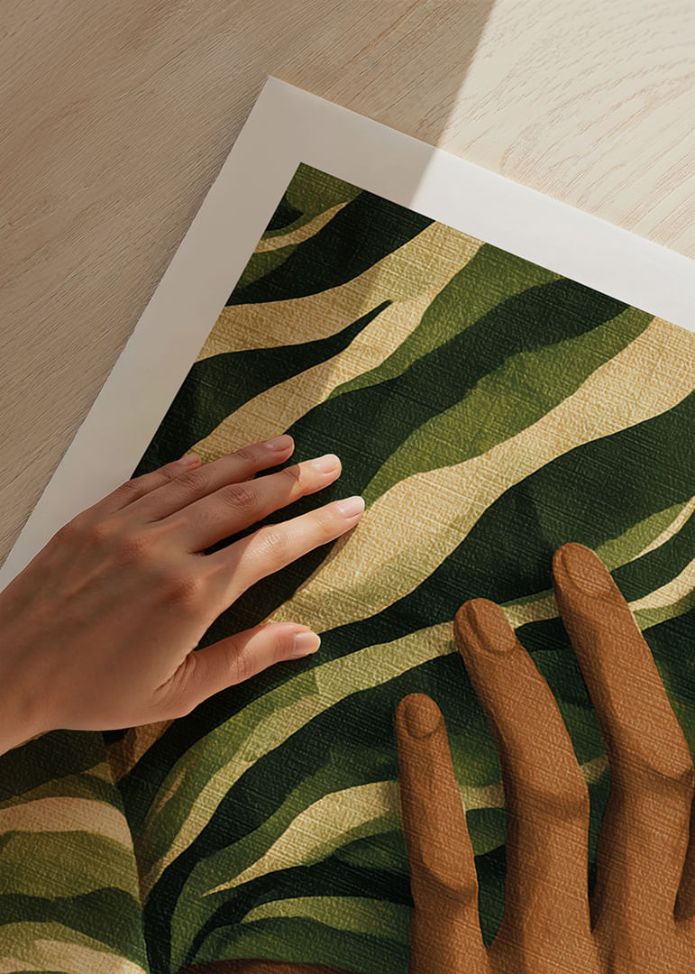 A mysterious face hides behind elegantly swirling lush foliage, creating a sense of calm and mystery. This poster captures the beauty of nature and its union with man in a sublime way. The bold green and brown color scheme adds a unique charm that instantly elevates the atmosphere of any room, giving a sense of natural peace.