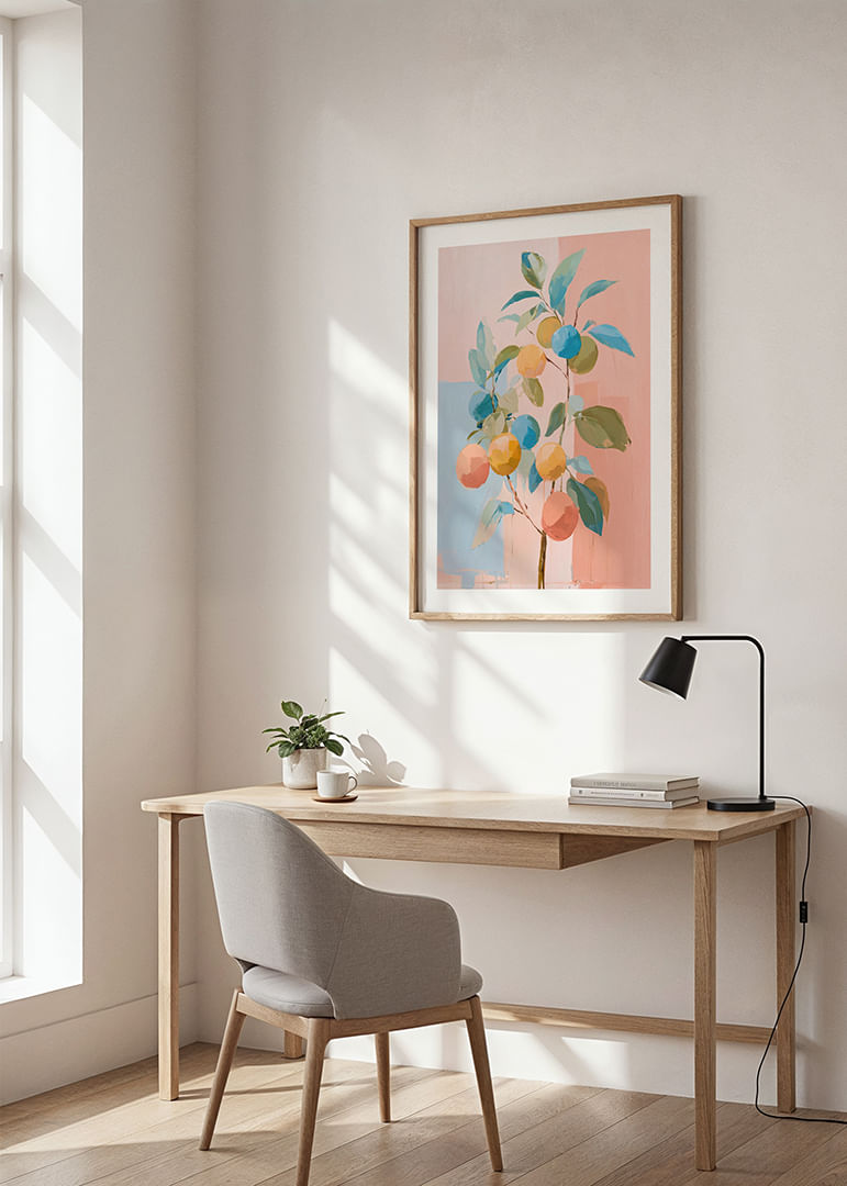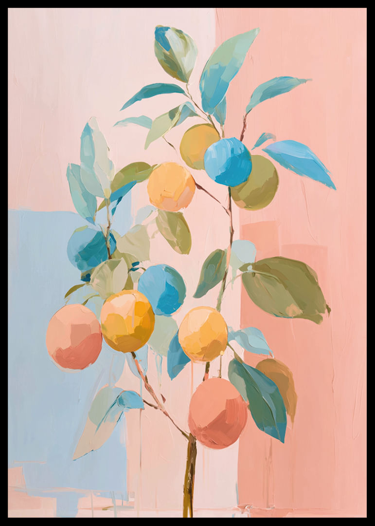 This poster catches the eye with its lovely pastel colors and vibrant fruits, delicately balanced on the branch. The combination of soft pink and green shades gives a feeling of calm and joy. The juicy fruits in warm tones stand out against the background and create a feeling of abundance. This poster is perfect for adding color and vibrancy to any room, creating a harmonious atmosphere.
