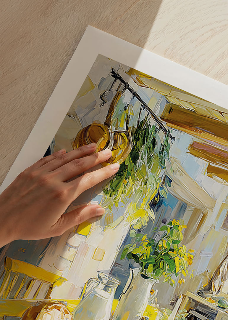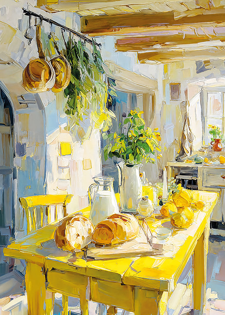This poster captures an idyllic country kitchen setting where the sun's golden rays dance across the rustic wooden table. With fresh bread, plants and an atmosphere of welcoming warmth, it instills a sense of peace and charm. The colours are bright and inviting, making this poster perfect for enhancing the atmosphere of your living room or kitchen and giving a taste of country life.