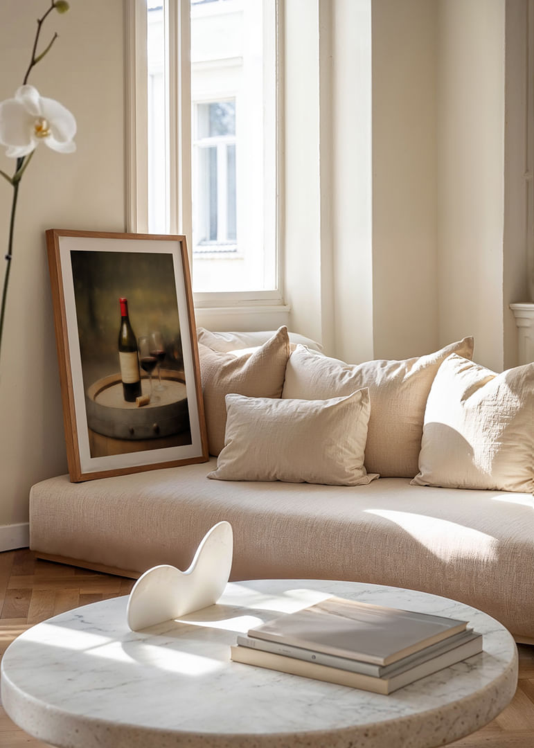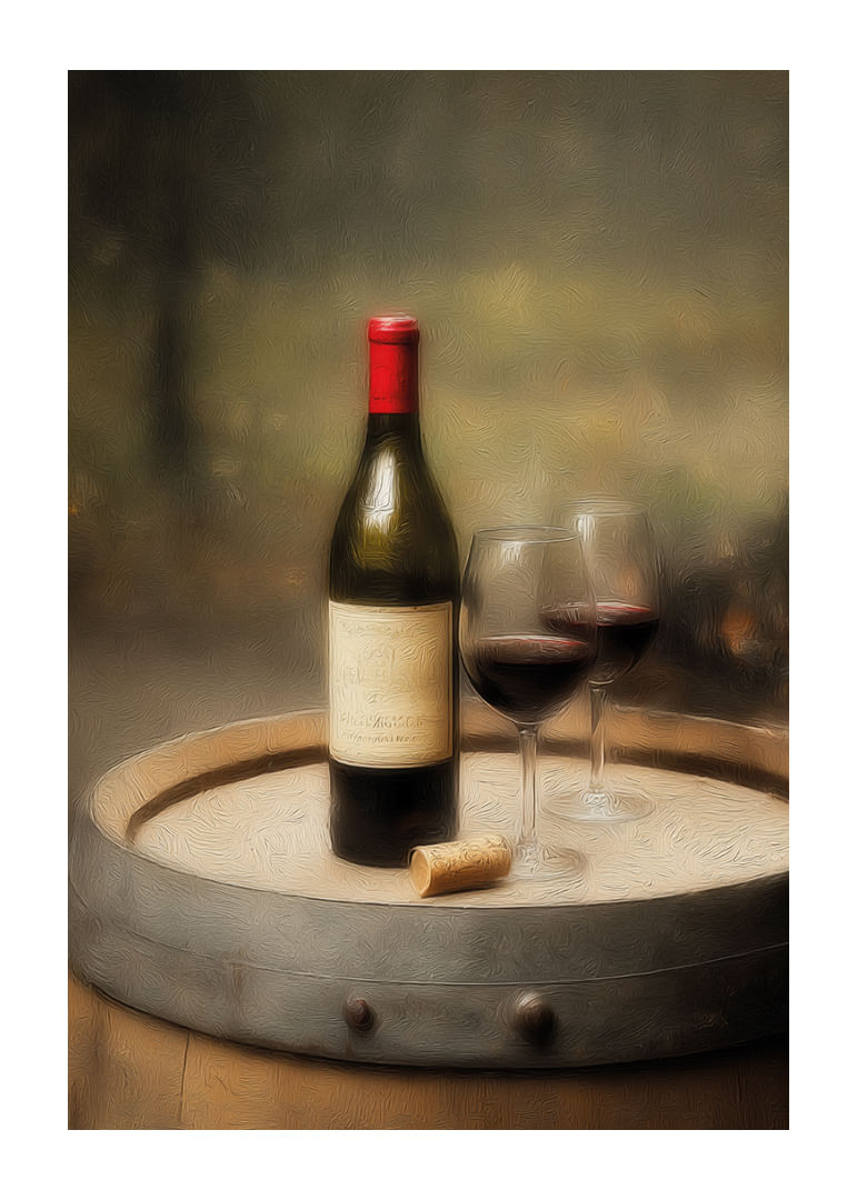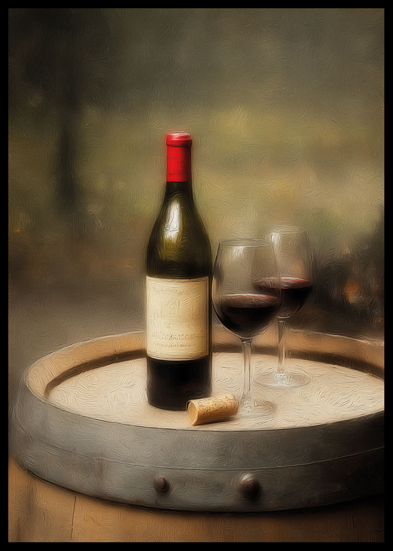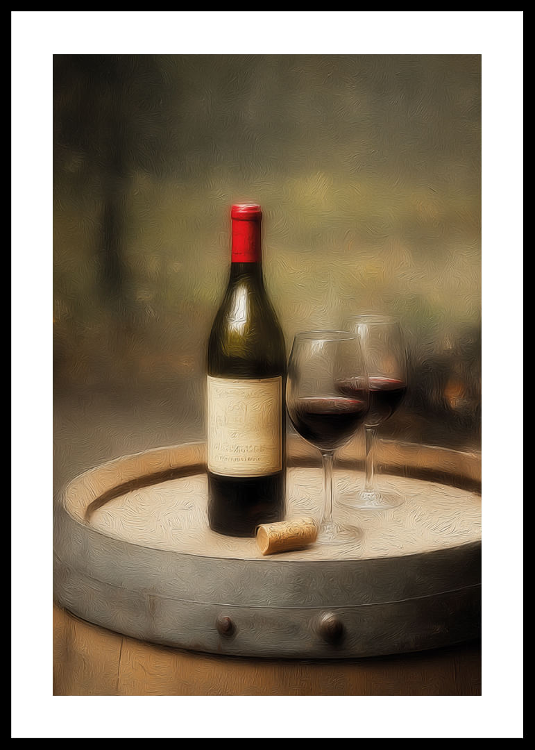 This poster reflects a timeless beauty with a wine bottle and two glasses on an old wine barrel. With its warm, earthy tones and inviting atmosphere, it captures a sense of rustic elegance and enjoyment. Perfect for creating a cozy and sophisticated atmosphere in any corner of the home, this poster invites relaxation and culinary moments. A must-have for the wine lover.