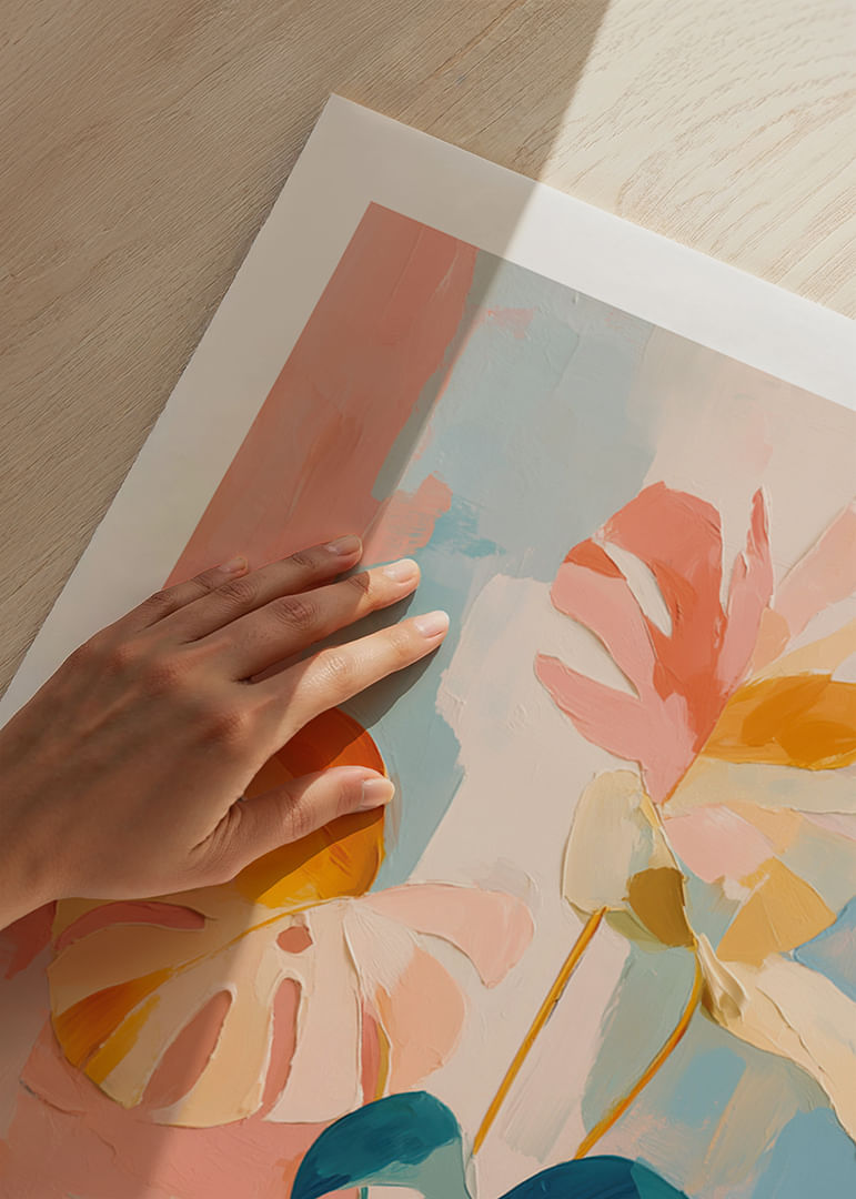 This poster catches the eye with its vibrant colors and dreamlike feel, where large tropical leaves in pink, turquoise and gold dance across a soft, pastel background. The contrast between the bright leaves and the soothing background creates a sense of peaceful joy. Perfect for transforming a living room or bedroom, the poster adds a sense of exotic elegance and freshness to your home.