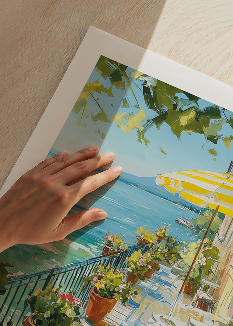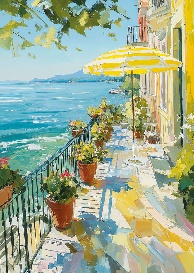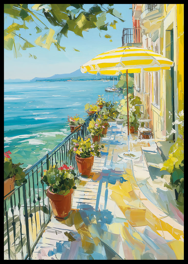 This poster captures the sunny charm of a Mediterranean terrace overlooking crystal clear water. Bright shades of yellow and green dance across the balcony, framed by flowers and a striped parasol. The contrast between the clear blue sky and the sparkling water creates a feeling of endless freedom. The poster adds a calming atmosphere to any room, transforming it into a peaceful oasis.