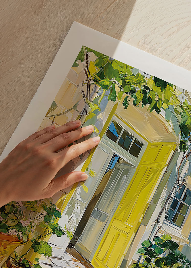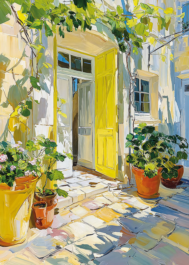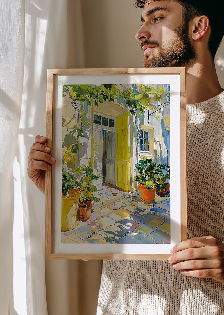 This poster captures a sunlit courtyard where vibrant colours in yellow and green tones dance across the surface. An open door invites you into a bright and inviting room, while potted plants thrive in the sunshine. The poster radiates a sense of light and warmth, transforming any room into a peaceful retreat, where the beauty of nature meets the simplicity and elegance of daily life.