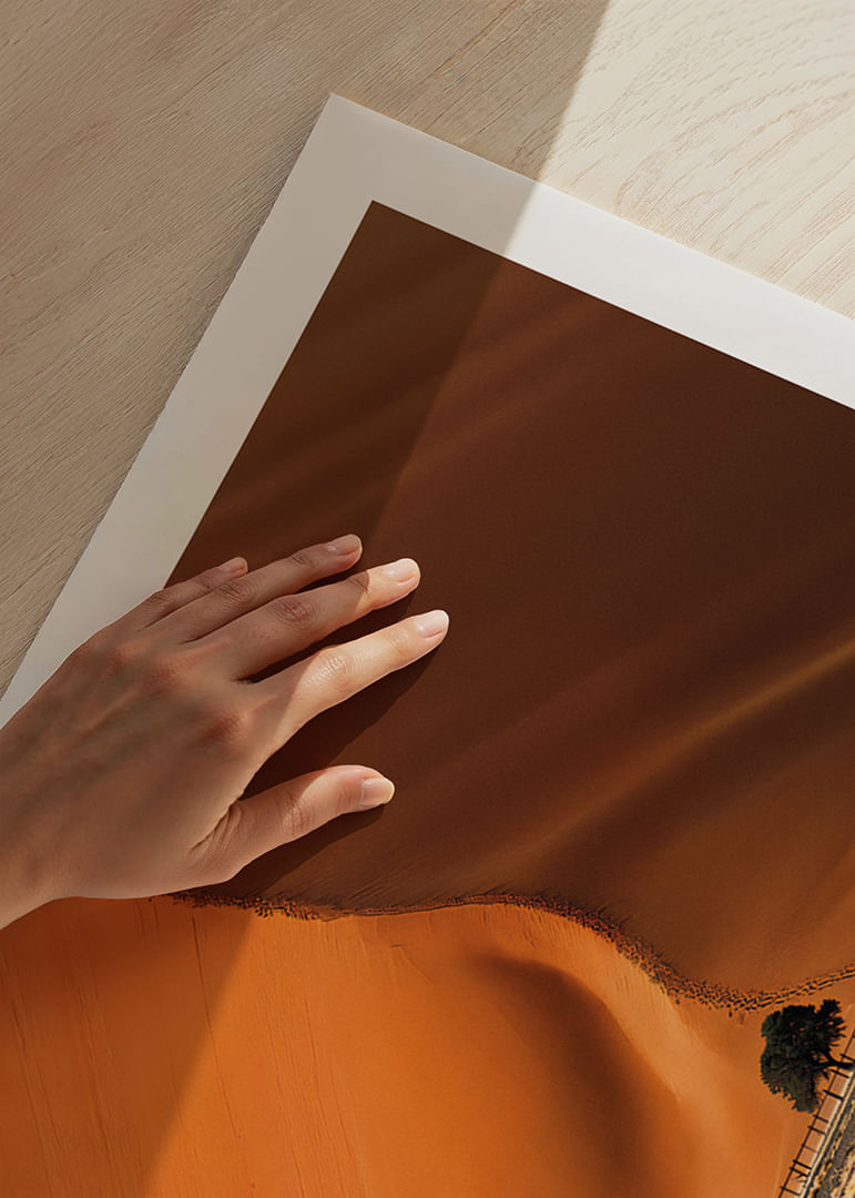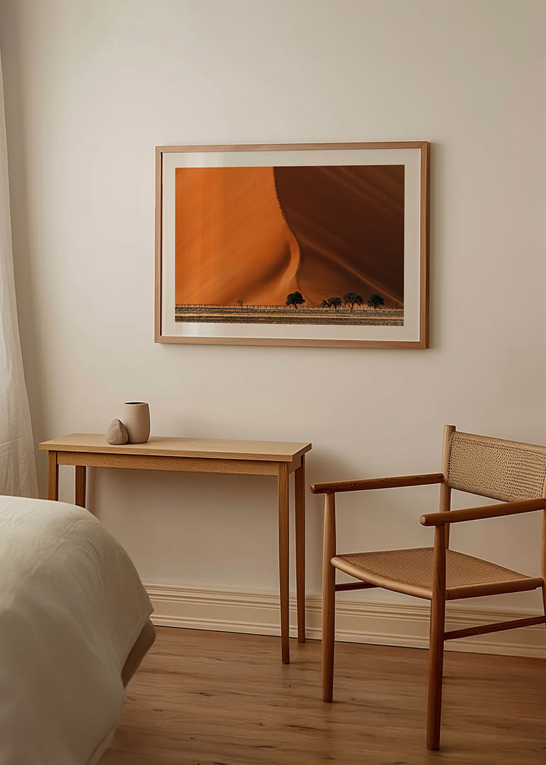 The first impression of this poster is the stunning contrast between the sky and the desert dunes. The soft, sweeping lines of the sand create a sense of endless harmony. The colors are warm and inviting, while evoking a sense of stillness and tranquility. This poster gives any room a timeless elegance and a reminder of the beauty of nature, perfect for creating a peaceful atmosphere.