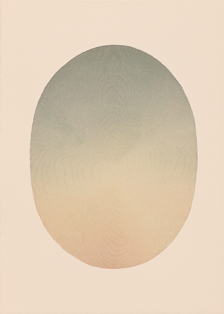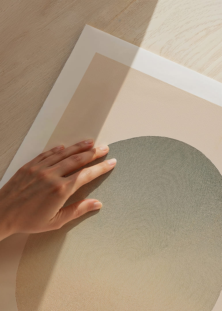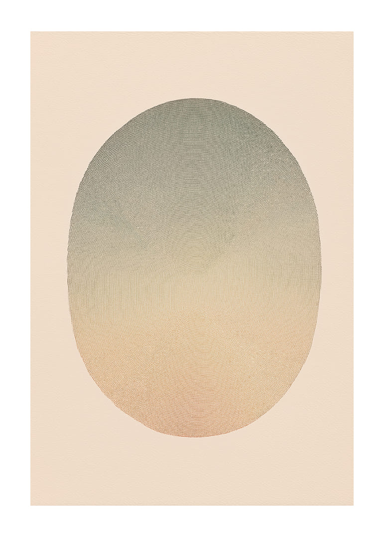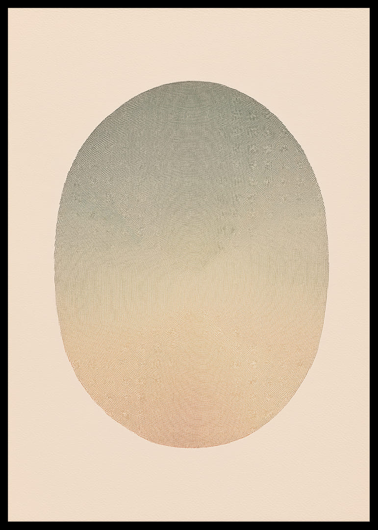 This poster catches the eye with a soft sphere of transitional tones that range from subtle earth tones to soothing hues. The timeless composition evokes a sense of calm and meditative stillness. With its clean aesthetic, the poster contributes a cool atmosphere and elegance, making it a perfect complement to a modern living room or a secluded corner for rest