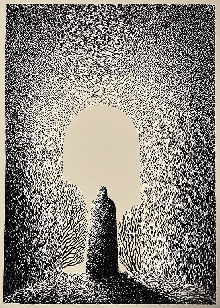 This poster captures a mystical atmosphere where a lone figure stands in a portal of light and shadow. The detailed pattern of the ink drawings creates a hypnotic movement that draws the viewer into a world of silence and contemplation. The poster enriches any room with a sense of mystery and tranquility, offering a place for reflection and inspiration in your home