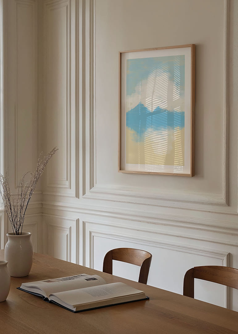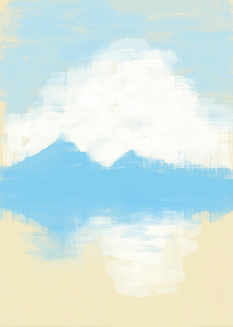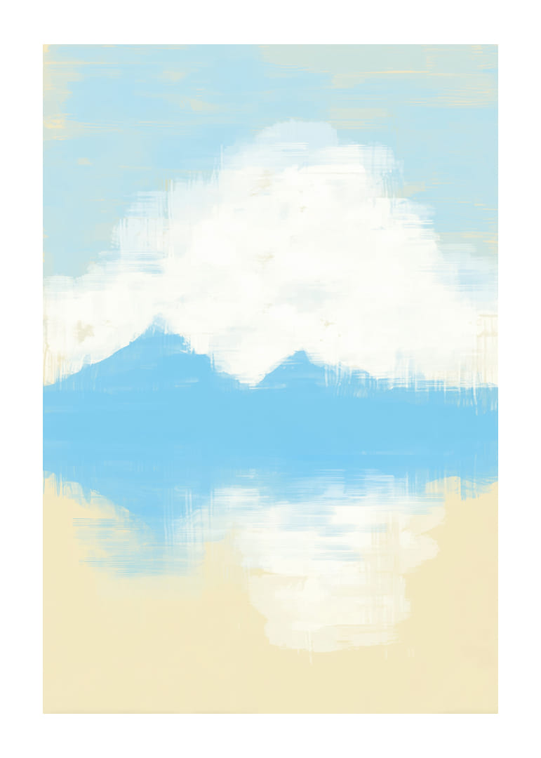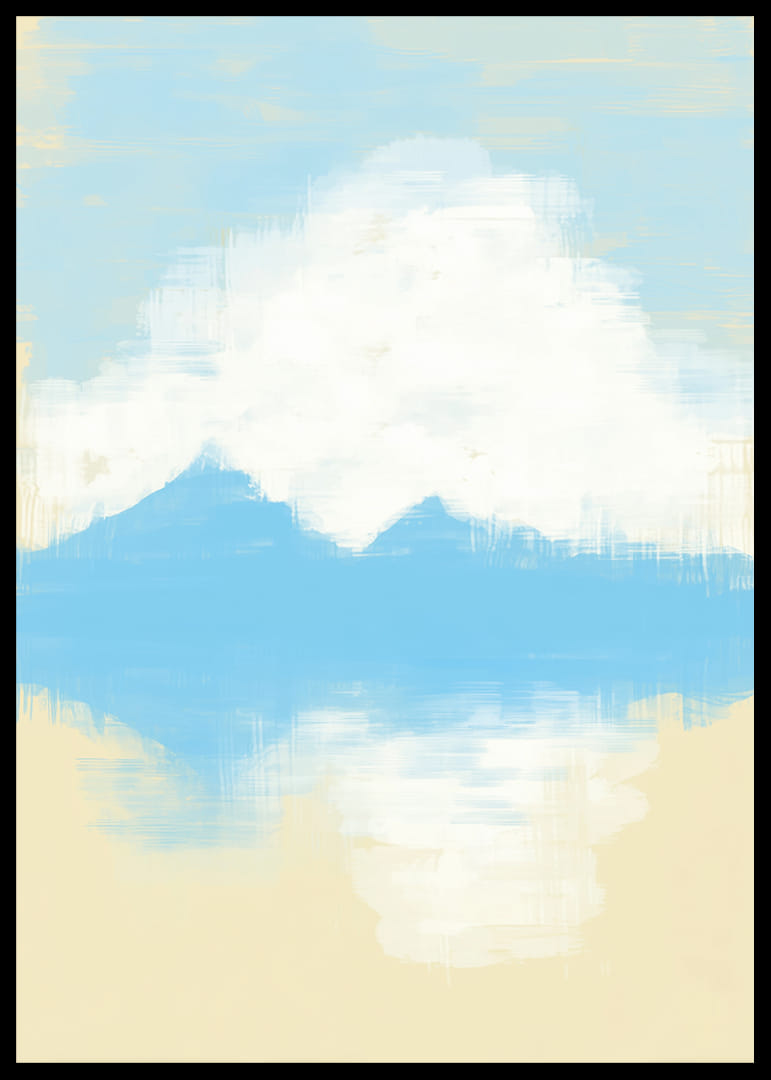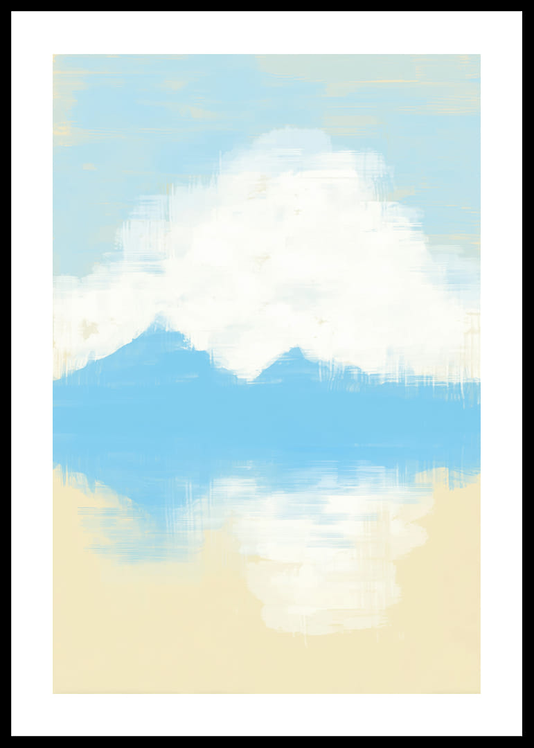 This poster captures a dreamlike view with its soft blue and white brushstrokes. The mountain peaks are reflected in a still water, giving a feeling of infinite peace and harmony. The colors and composition create a relaxing atmosphere that instantly transforms any room into a sanctuary. This poster will be the perfect backdrop for meditation or quiet moments at home
