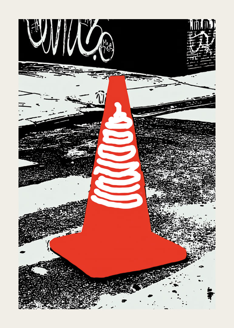 The colorful orange cone with its swirling white lines stands out as an artistic centerpiece in the urban setting. This poster captures the pulse of the city with raw, graffiti-adorned backgrounds and the dramatic light from the texture of the pavement. Perfect for energizing any room, the poster combines the power of cities with a unique visual aesthetic and will be a conversation piece in any home