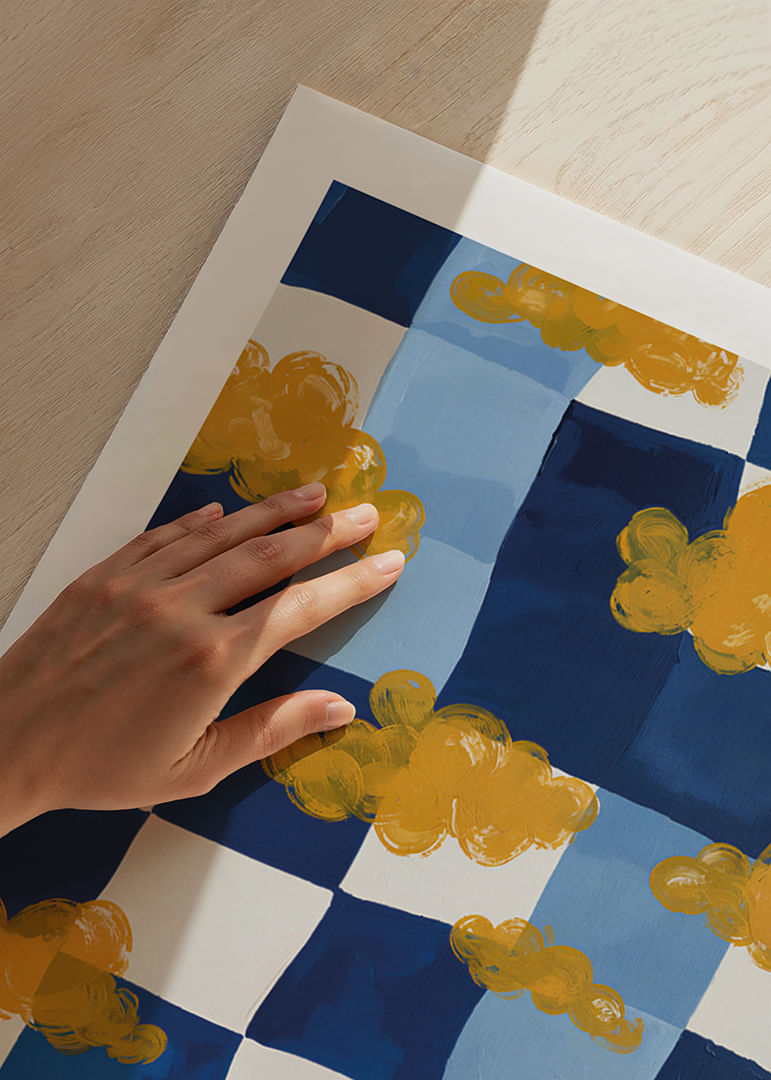 This poster captures a dreamlike world where golden clouds float over a bold blue and white chessboard. The artwork combines imaginative play with meticulous execution, creating a harmonious balance between color and form. The tranquil atmosphere is enhanced by the soft clouds that blend into the background. With this poster, you can transform any room into a calm and meditative oasis