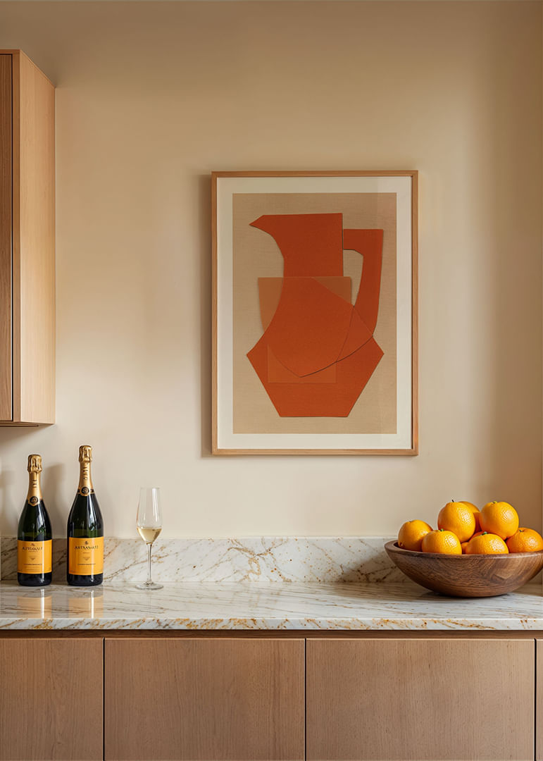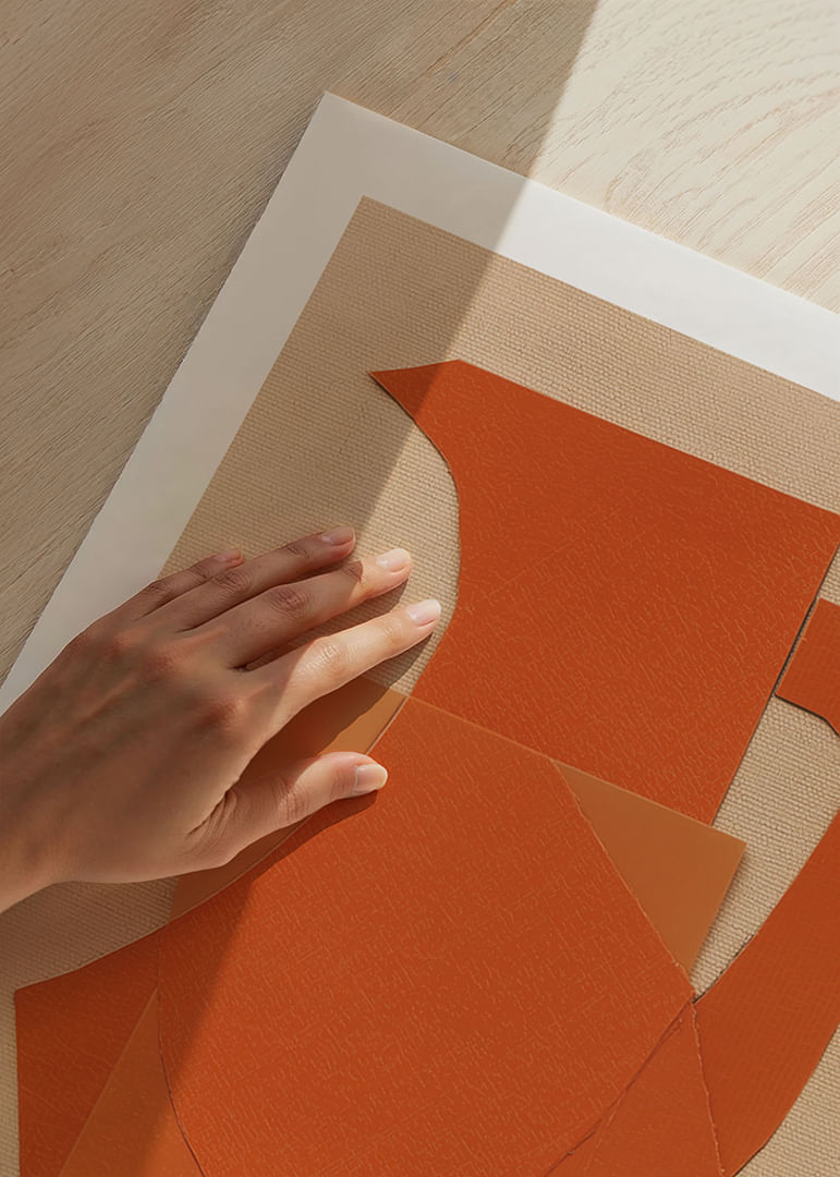 Abstract shapes in terracotta tones dominate this poster, giving it a harmonious and elegant feel. The geometric elements create a visual balance and subtle movement that captivates the eye. With its soft, earthy tones, the poster fits perfectly in modern environments and brings a warm, sophisticated atmosphere to any room it adorns. It is both artistic and inviting