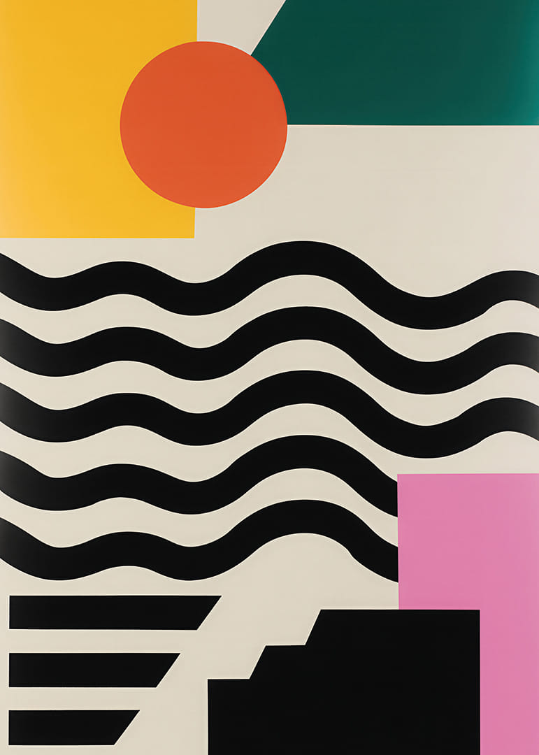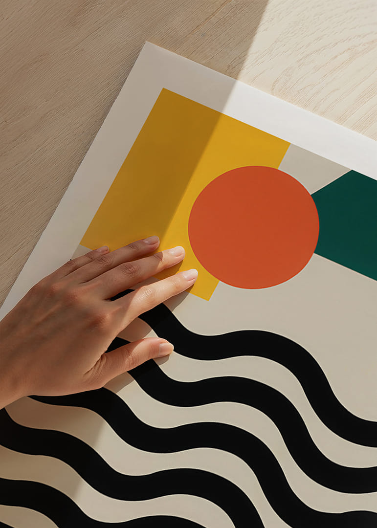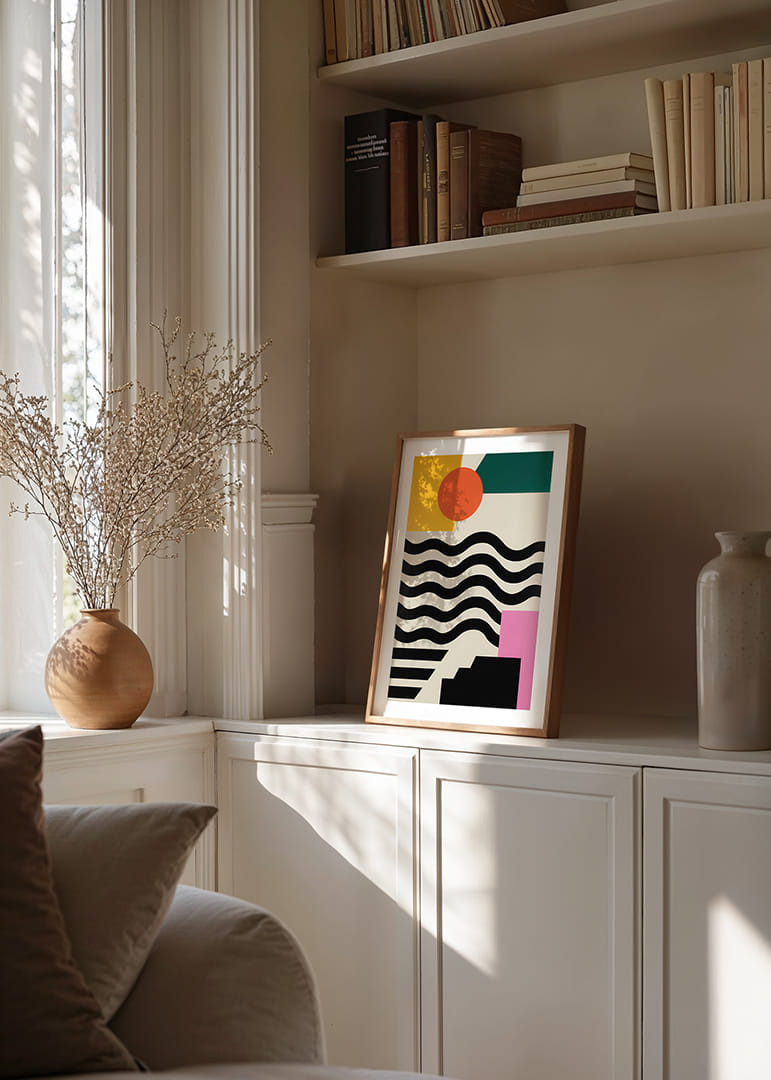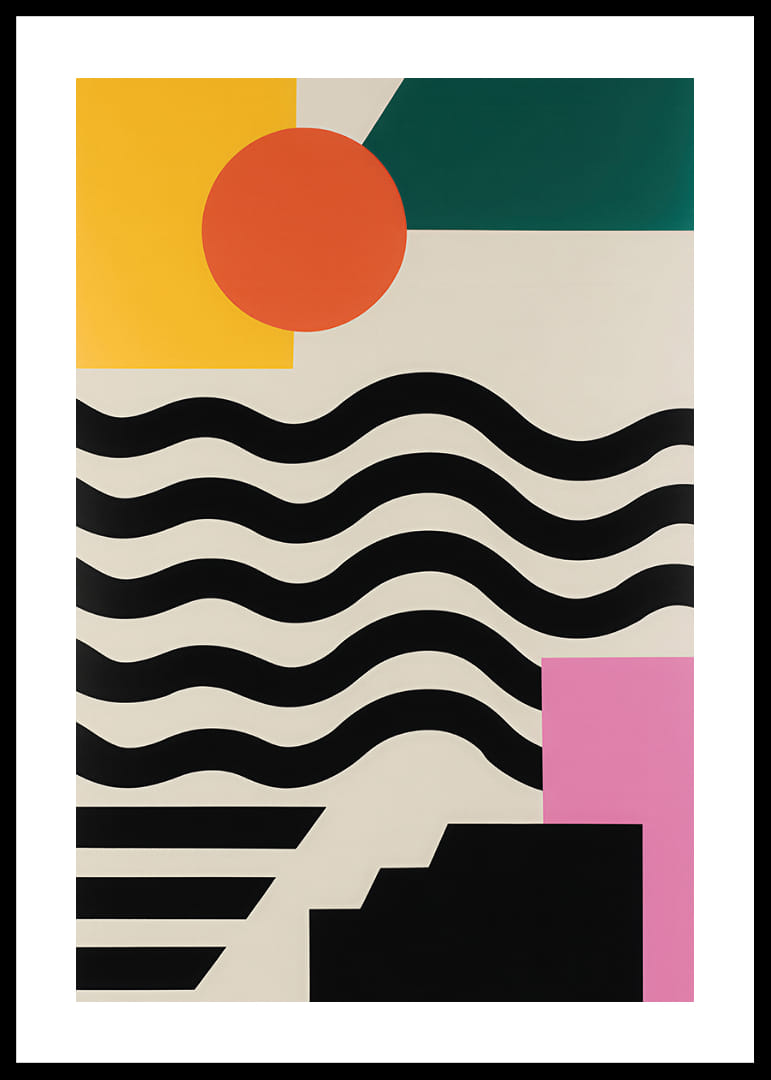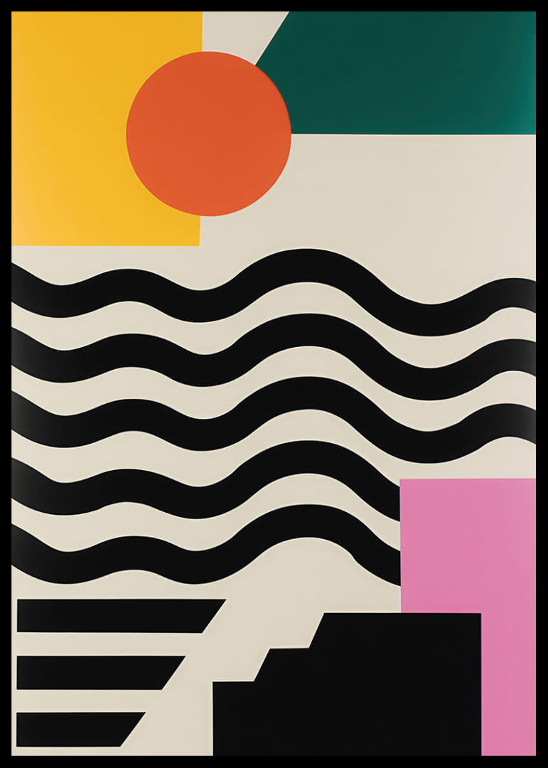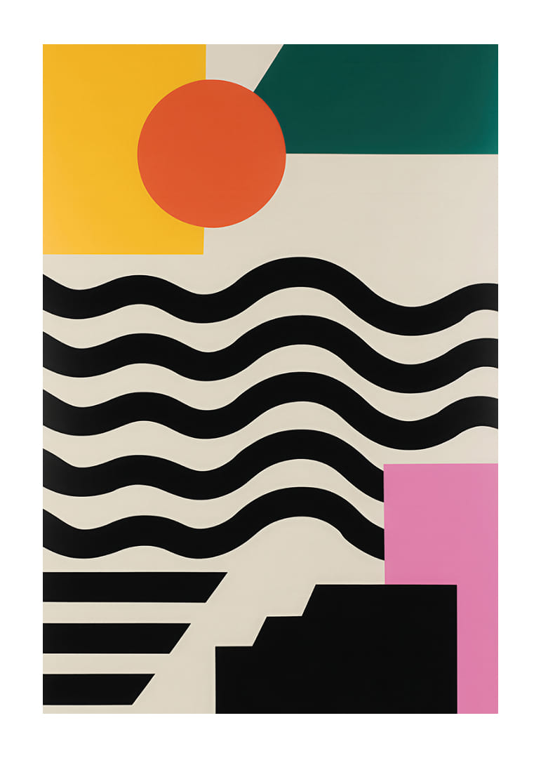 This poster catches the eye with strong contrasts and geometric shapes that create a dynamic rhythm. Waves of black lines are beautifully broken against the bright, colorful blocks of orange, yellow and pink. This modern poster adds an energetic touch to any room and creates a vibrant, yet harmonious atmosphere. Perfect for the style conscious who wants art that evokes emotions.
