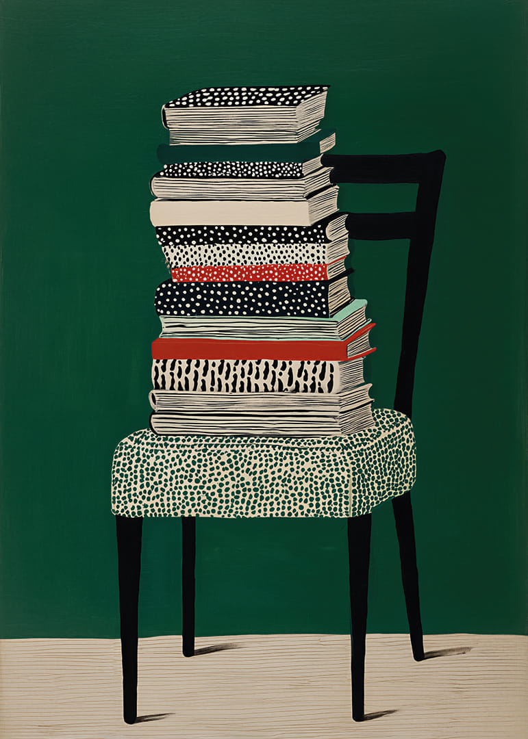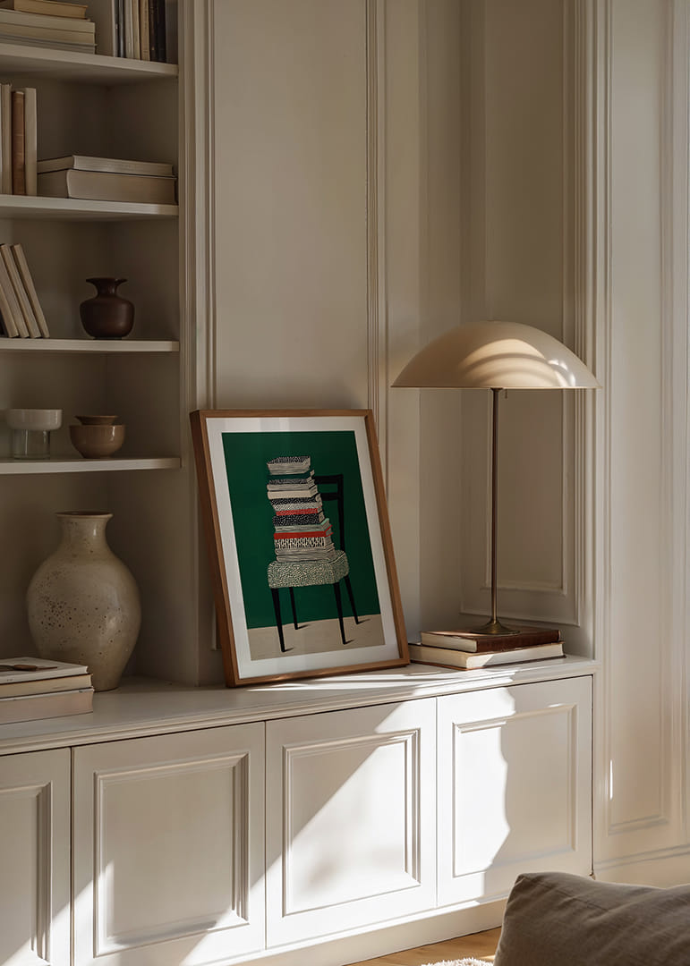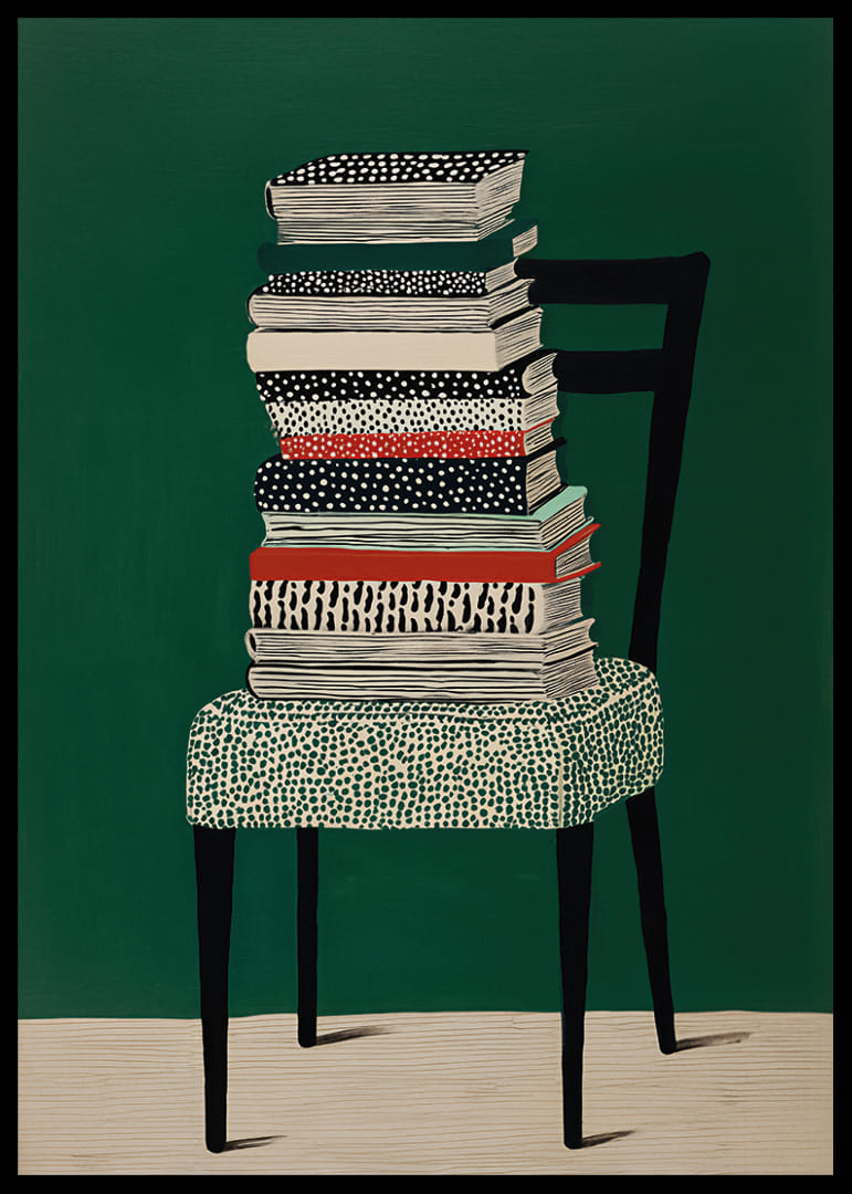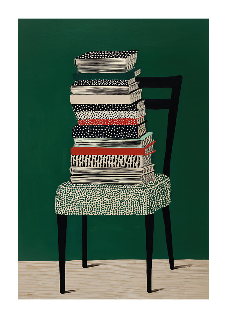 In this poster, the eye is caught by a colorful stack of books balancing on an elegant chair against a deep green background. The patterns on the book spines create a dynamic rhythm that enriches the room with creative energy. This poster not only fills your home with vibrant style, but also conveys a sense of balanced order and charm. A perfect addition to enhance the atmosphere of any room.