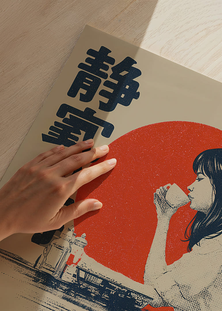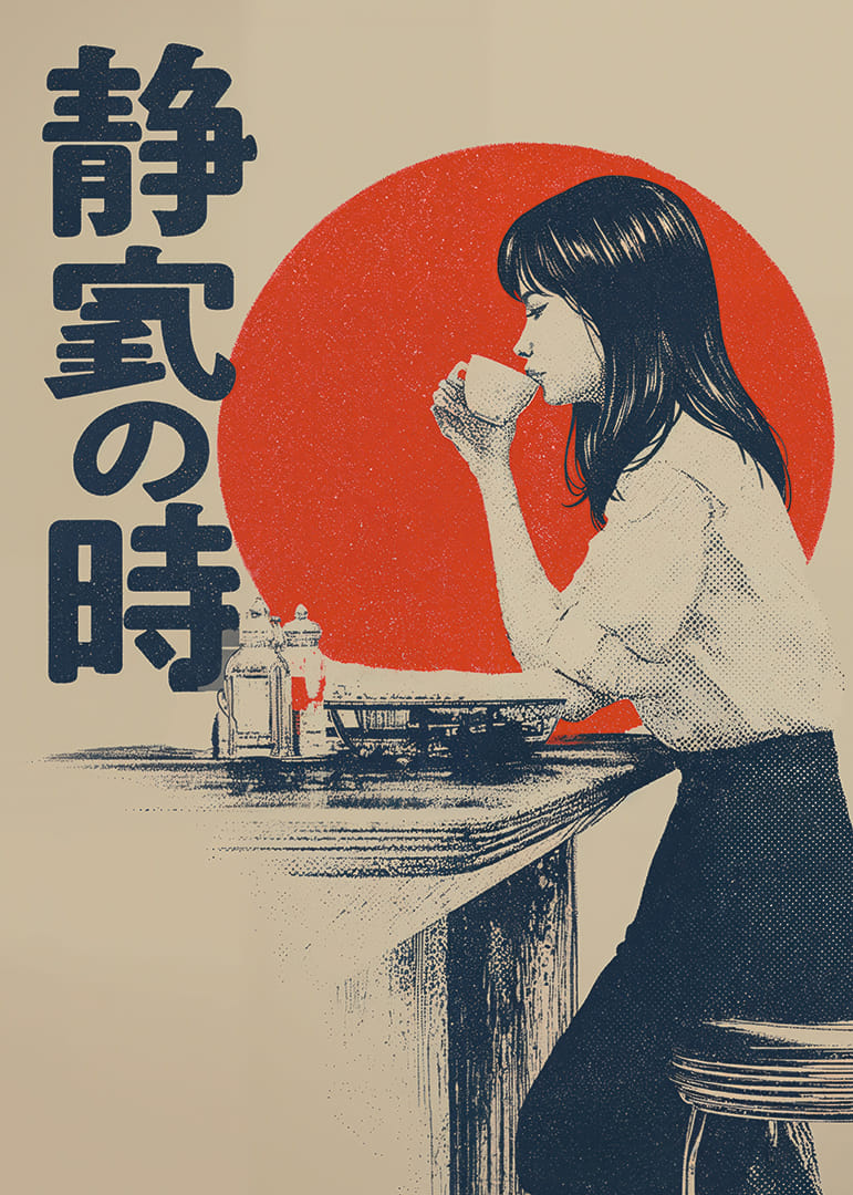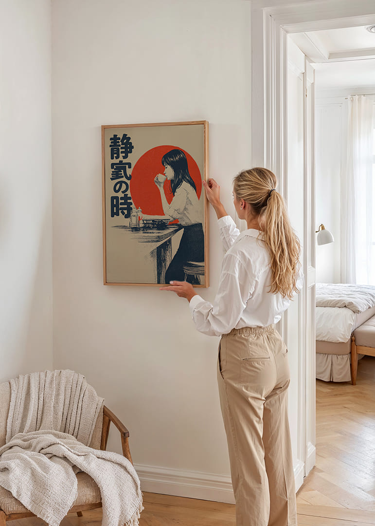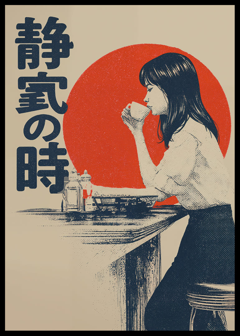 Feel the peace and tranquility with this beautiful poster of a woman enjoying a moment of solitude. She sits at a table with a hot drink in her hand, surrounded by a deep red sun as a backdrop. The simple color palette gives a sense of timelessness and contemplation. This poster captures the perfection of finding stillness in everyday life and elevates the atmosphere of your home by adding a sense of peace and beauty.