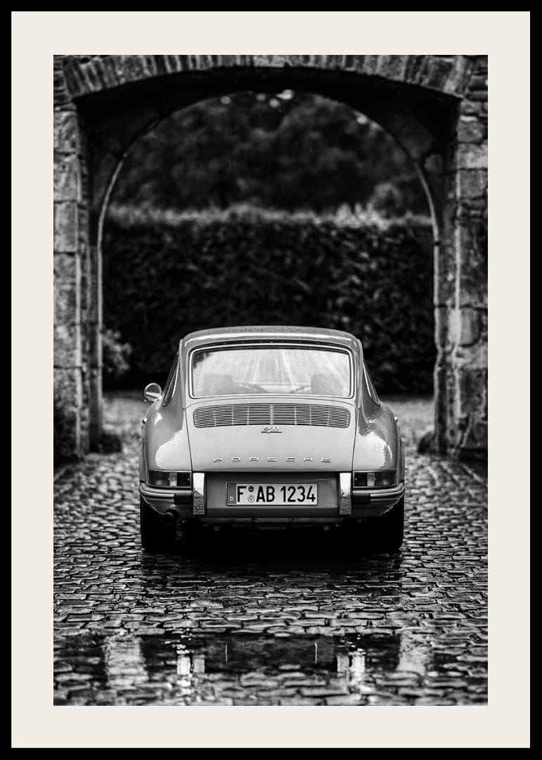 This poster captures the essence of timeless elegance with a classic Porsche 911, specifically an early model from the first generation (often referred to as the "Ur-911"), which was produced between 1964 and 1973. The sleek rear combined with the paved ground conveys a sense of nostalgia and freedom. The raindrops enhance the dramatic atmosphere, making this poster a perfect detail to add a touch of vintage charm and history to your home.