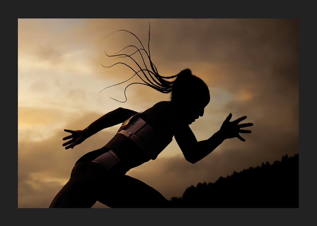 Silhouette of Astri Ayo Lakeri Ertzgaard competing in the women's 400 meters during the Norwegian Athletics Championships on August 1, 2025 in Askøy, Norway.