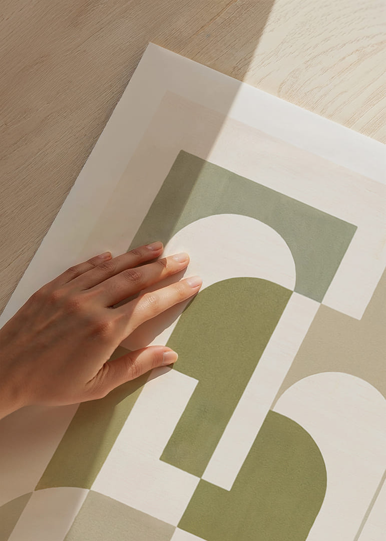 This poster immediately catches the eye with its soft, flowing shapes and subtle colors. The muted shades of green and beige create a calm and elegant expression that fits perfectly in any modern interior. The harmonious symmetry and abstract design give a sophisticated impression, making the poster a perfect choice to elevate the sense of style in any room.