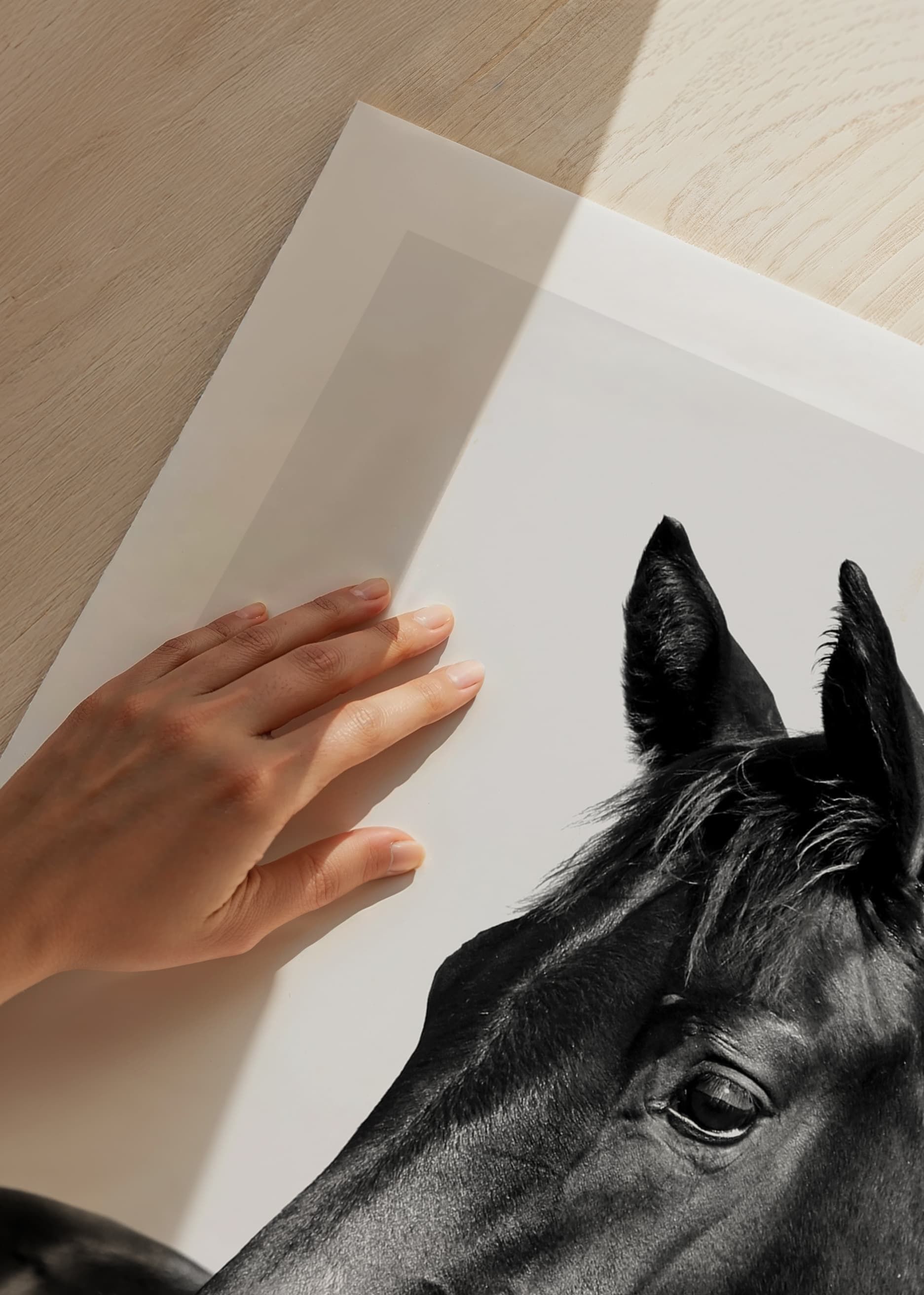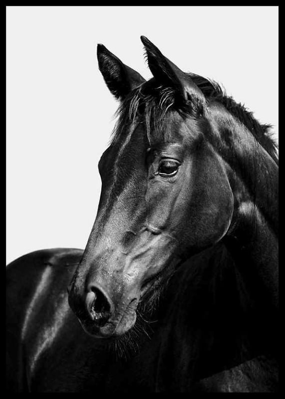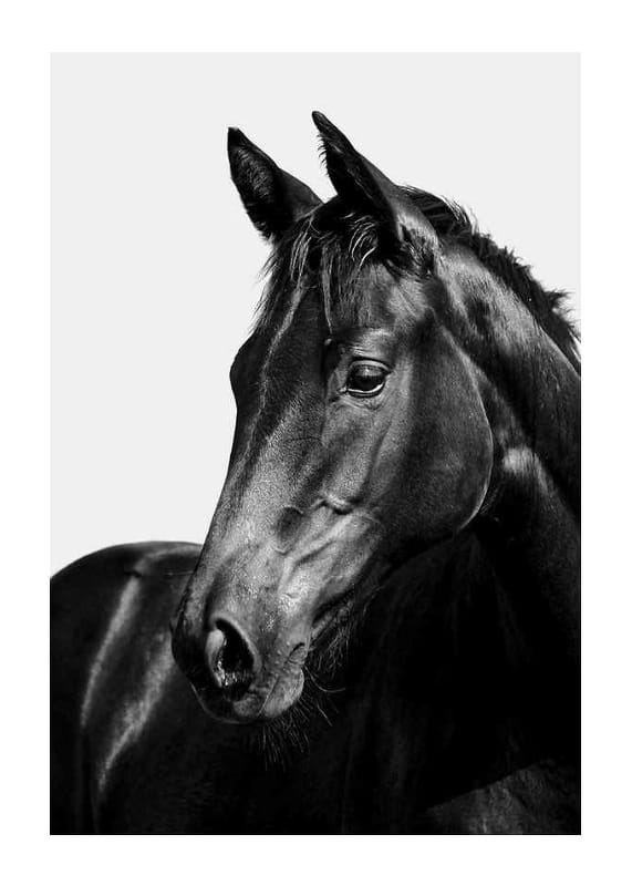 A close-up of a black horse's head with detailed fur and pointed ears, captured in black and white against a light background. Sharp contrasts highlight the horse's expressive features and make this motif a stylish choice. The poster fits both modern and classic interiors for a timeless feel.
