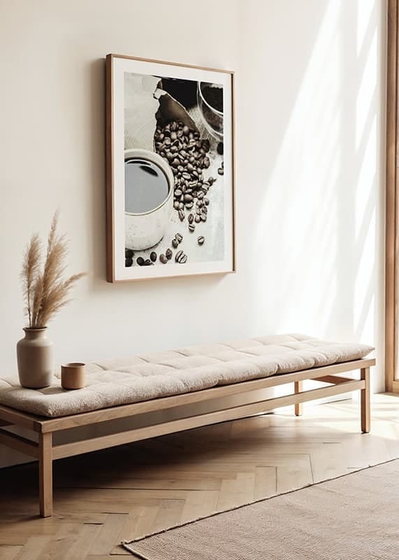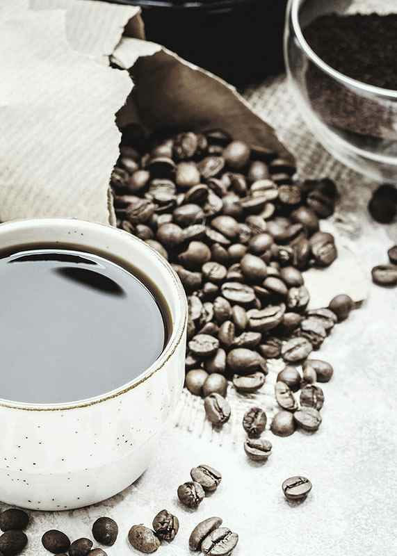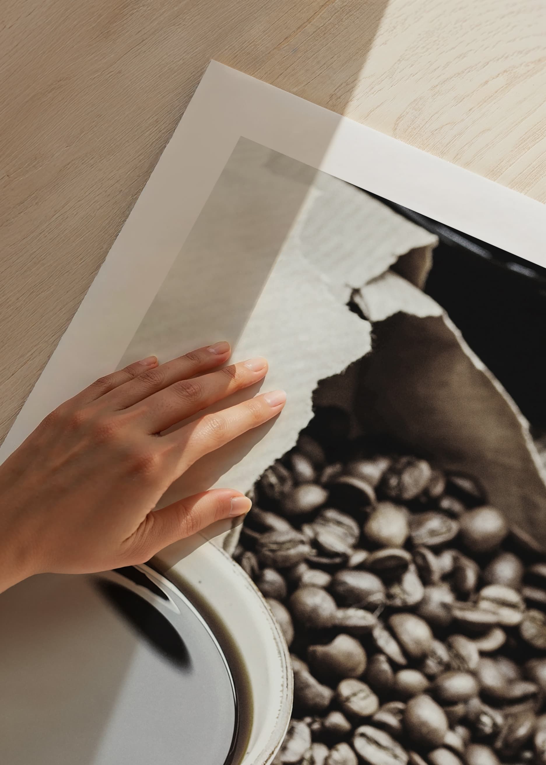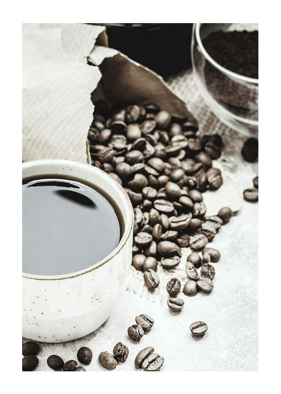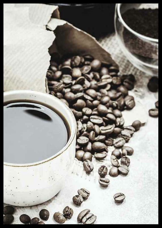 A close-up of a cup of black coffee next to scattered coffee beans and an opened paper package. Warm brown and beige shades dominate the motif, creating an inviting feel. This poster highlights the character of coffee and is particularly suitable for kitchens or dining rooms where everyday life takes center stage.