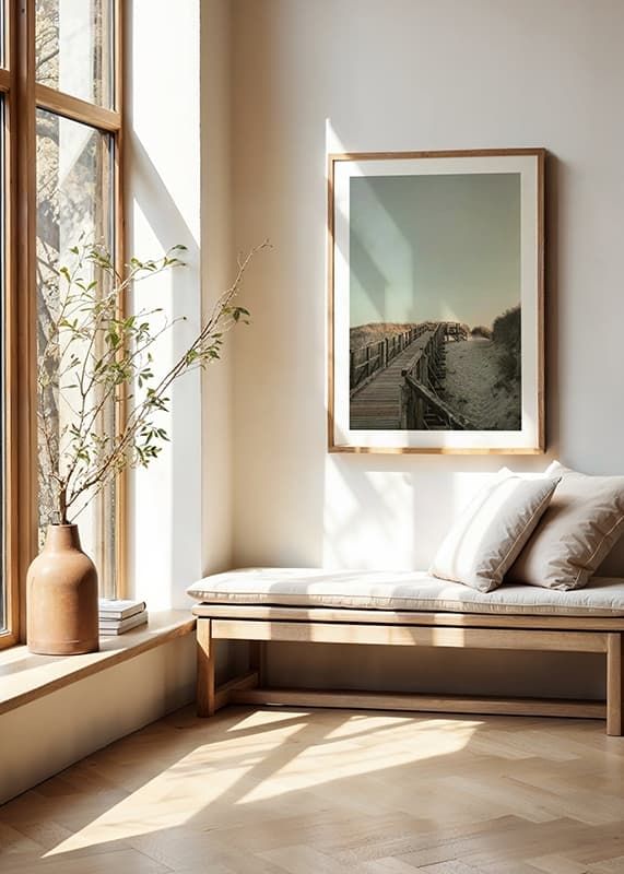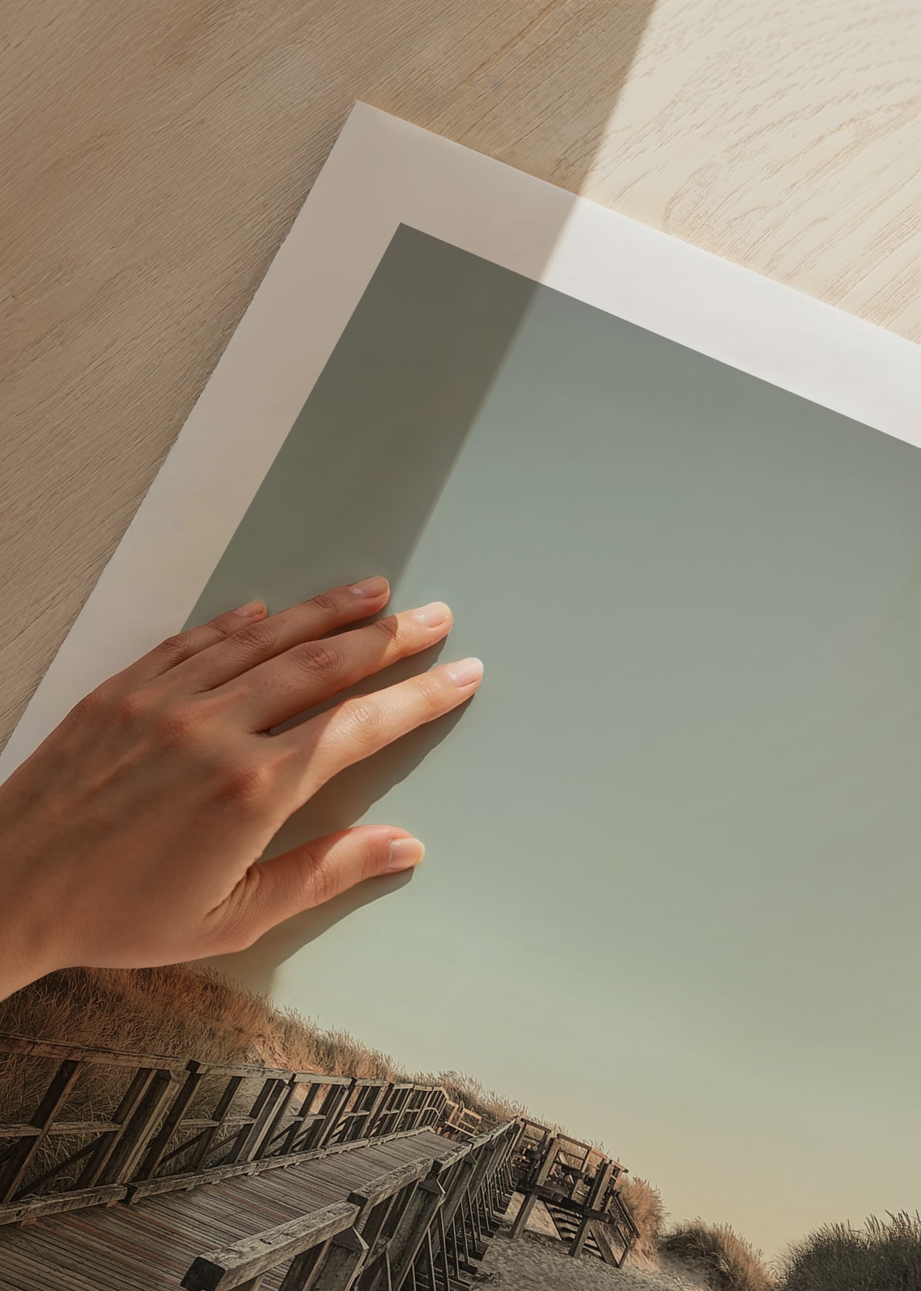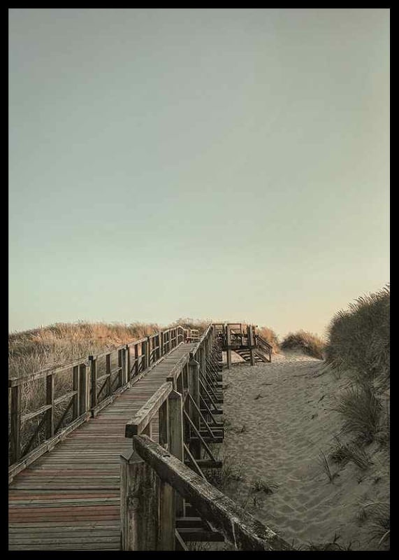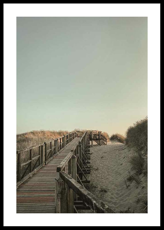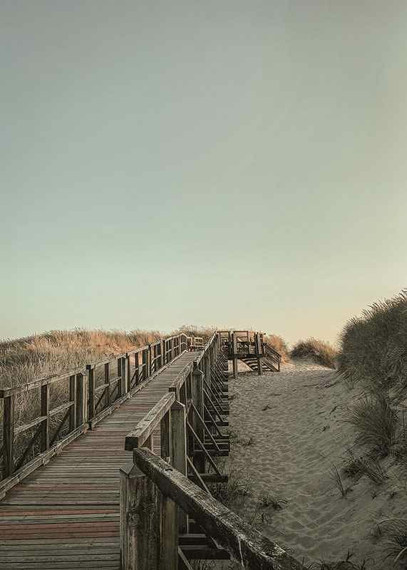 A beach motif where a wooden pier leads over soft sand dunes surrounded by tall beach grass. Light pastel sky creates an open and uncluttered feel to the image. This poster gives a calm touch of coastal environment and fits nicely in everything from living rooms to hallways where a natural expression is desired.