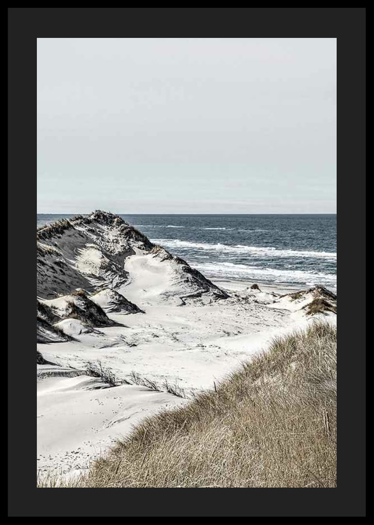 Sand dunes with grass in the foreground meet the waves of the sea under a cloudy sky. Light beige and gray shades characterize the motif, where soft shapes in the sand contrast with the blue sea. This nature poster provides a stylish element for the living room, bedroom or home office where you want a calm and timeless expression.