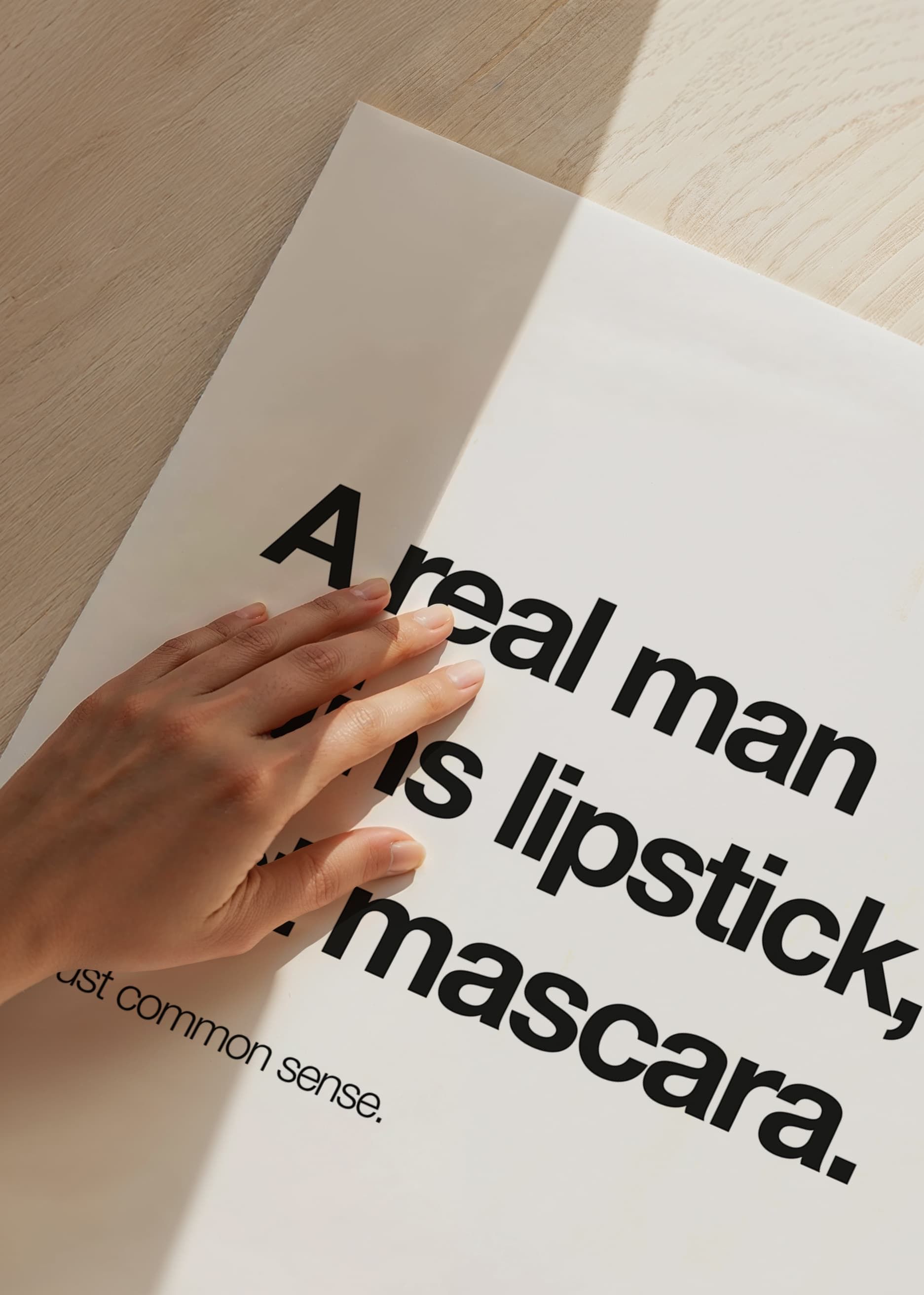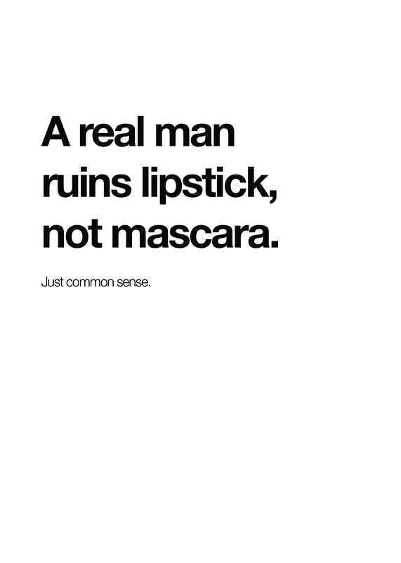 The motif consists of a clear English quote in black text against a white background, where the message reads: 'A real man ruins lipstick, not mascara.' Below the quote is supplementary text in smaller style. The clean and graphic design gives the poster a stylish character and works well in both bedrooms and hallways where a personal tone is desired.