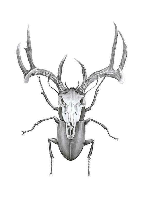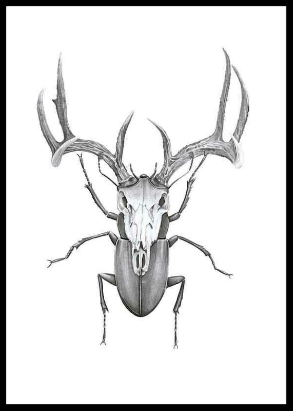 The motif consists of a stylized beetle where the body is joined with a detailed deer head and large horns, all drawn in black and white with a thin pencil line. This unexpected meeting between the forms of the animal kingdom gives the poster a graphic and contemporary feel. Playful interpretation in the Swedish illustrator's detailed pencil style where classic meets modern - typical of Sanna Wieslander's characteristic and surreal expression.