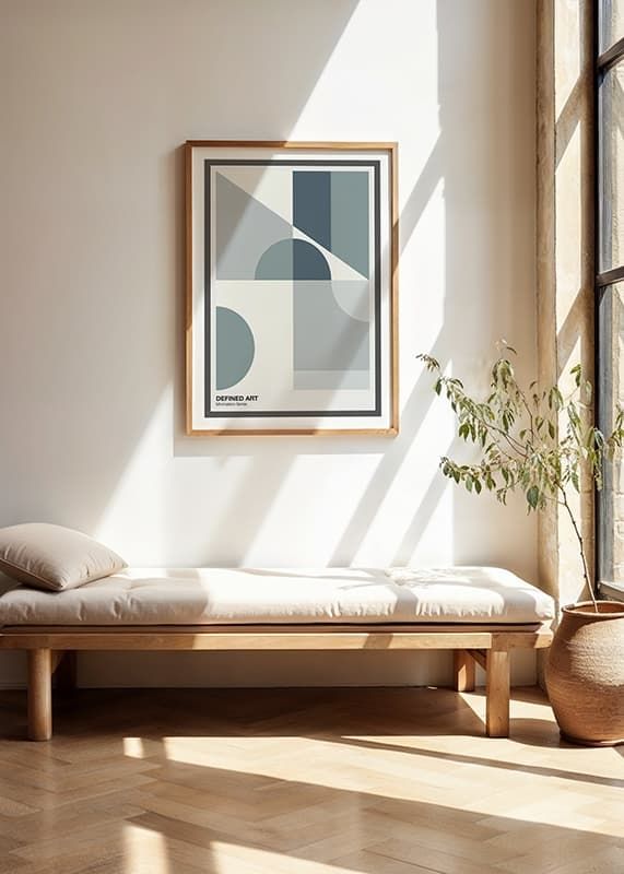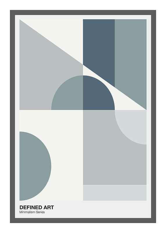 The motif consists of rectangles, circles and triangles in muted blue and grey tones against a white background. The style is minimalist and the composition is balanced, giving a modern impression. A thin white frame and the text 'Defined Art Minimalism Series' adorn the corner of this poster, which is suitable for both living rooms and study rooms.