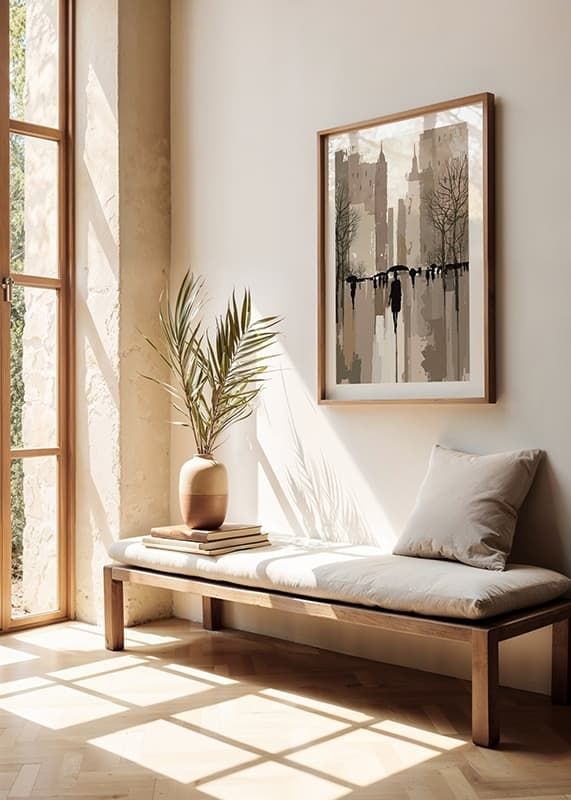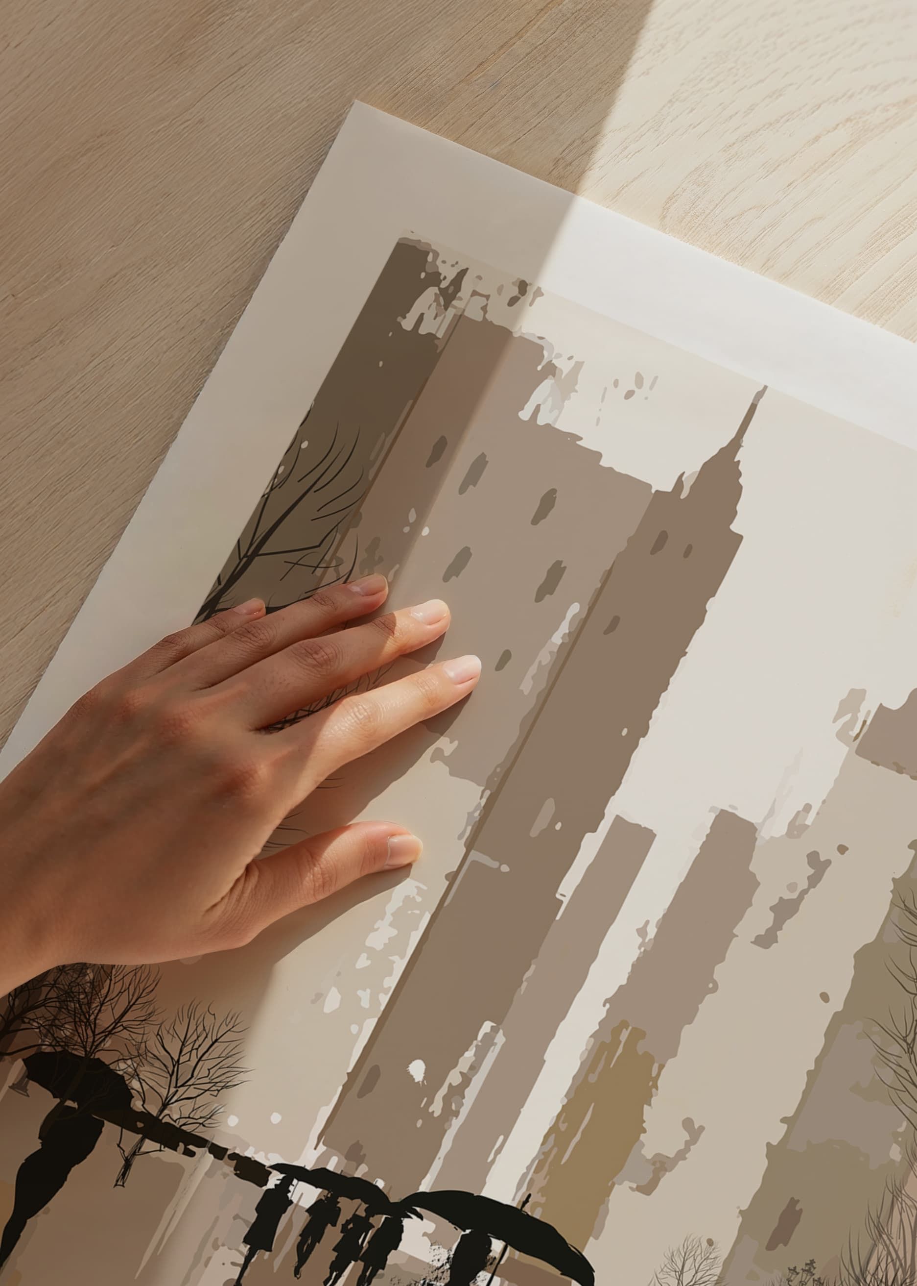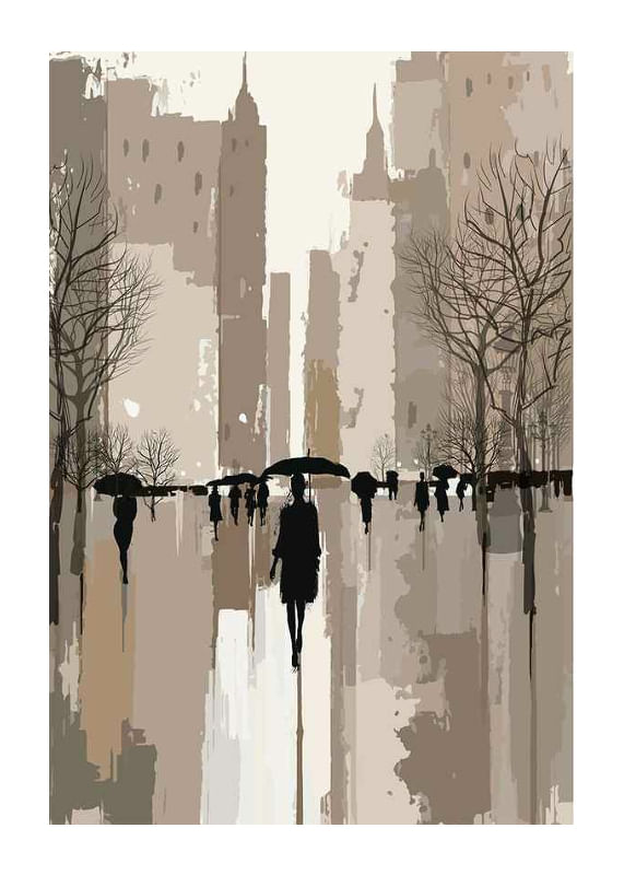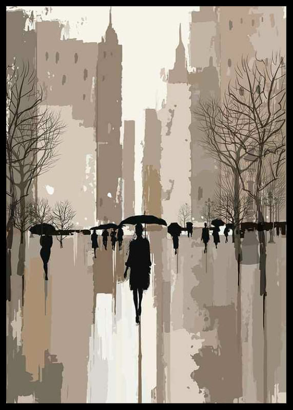 Silhouettes of people with umbrellas move through a city street surrounded by tall buildings and bare trees. Dull brown and beige shades dominate the motif and give an autumnal impression. The graphic style and balanced tones make the poster a discreet eye-catcher in the living room or hallway.