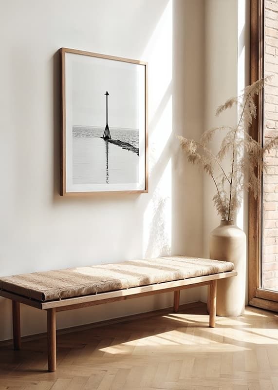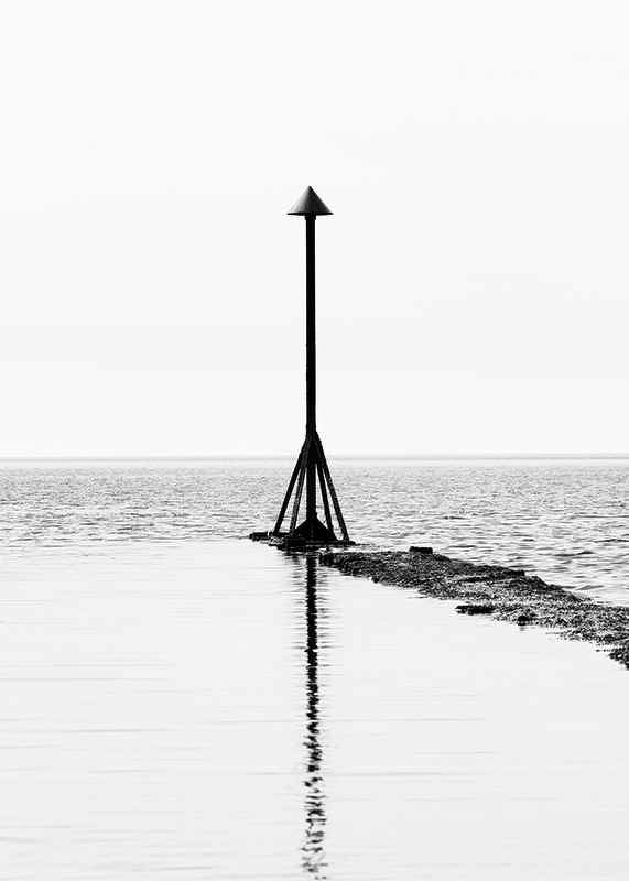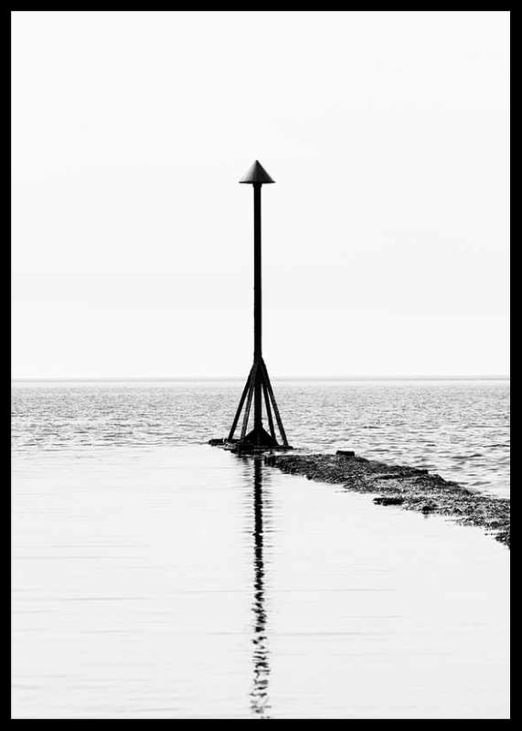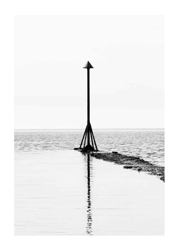A lone, conical-topped seamark stands out on a stone pier that extends into the water. Clear black-and-white contrasts and graphic simplicity characterize the motif. The water surface reflects the seamark, creating a balanced and calm feeling. This poster fits in rooms where simplicity and timelessness are valued.