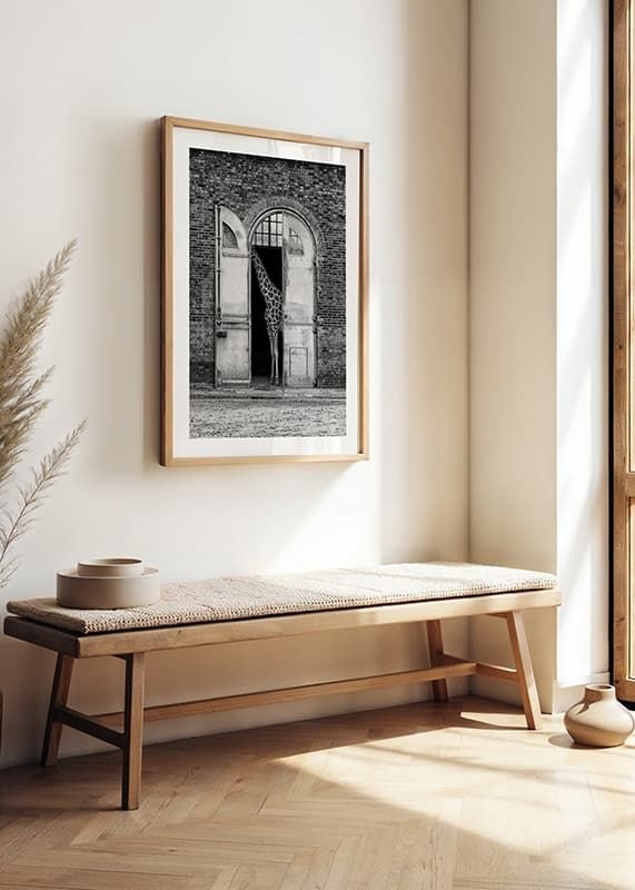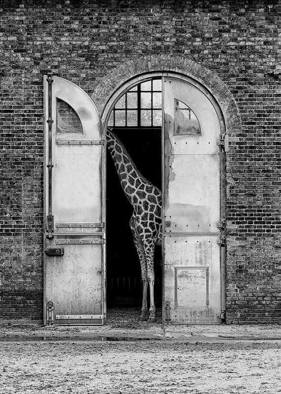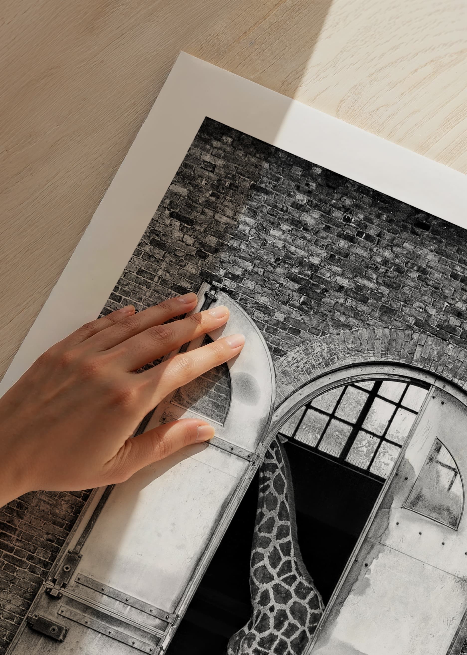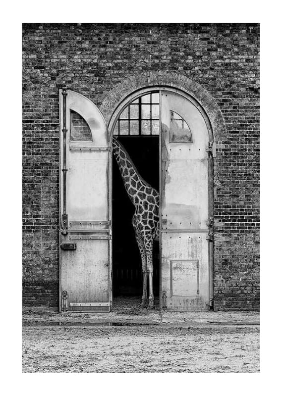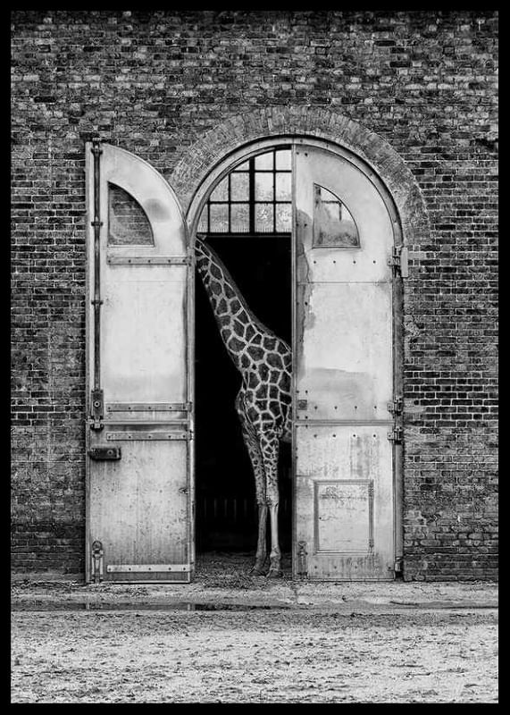 A full-length giraffe with its head towards an open gate in a high brick wall, captured in black and white. The large metal gates stand on a wide gable and highlight the animal's long silhouette against the dark indoor environment. This poster combines animal motifs with industrial details and is suitable for both children's rooms and modern living rooms.