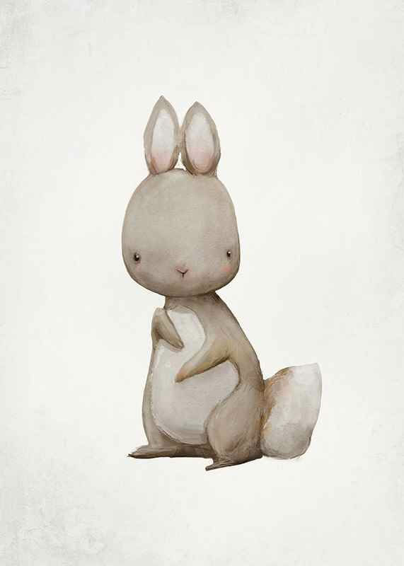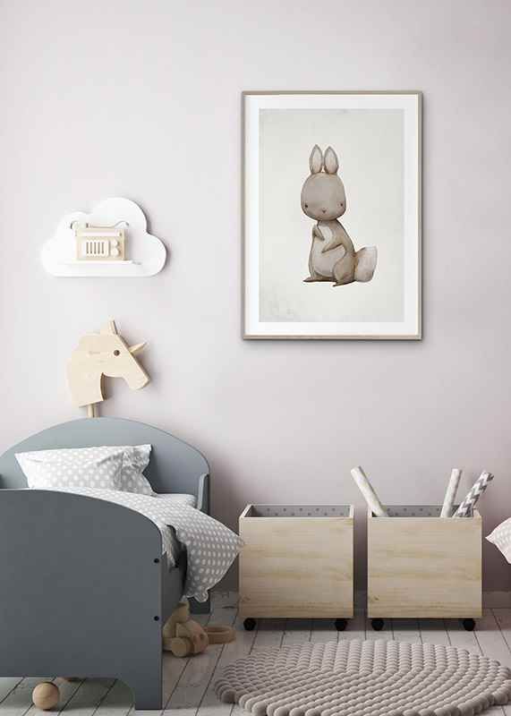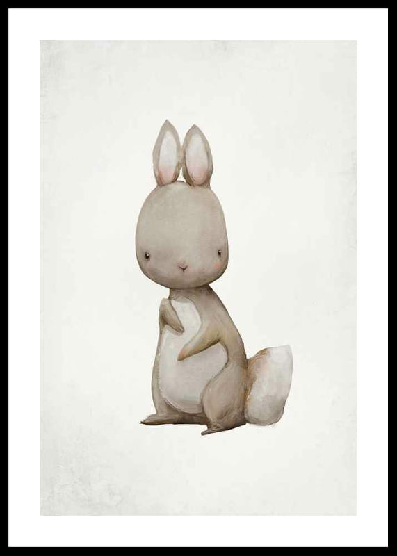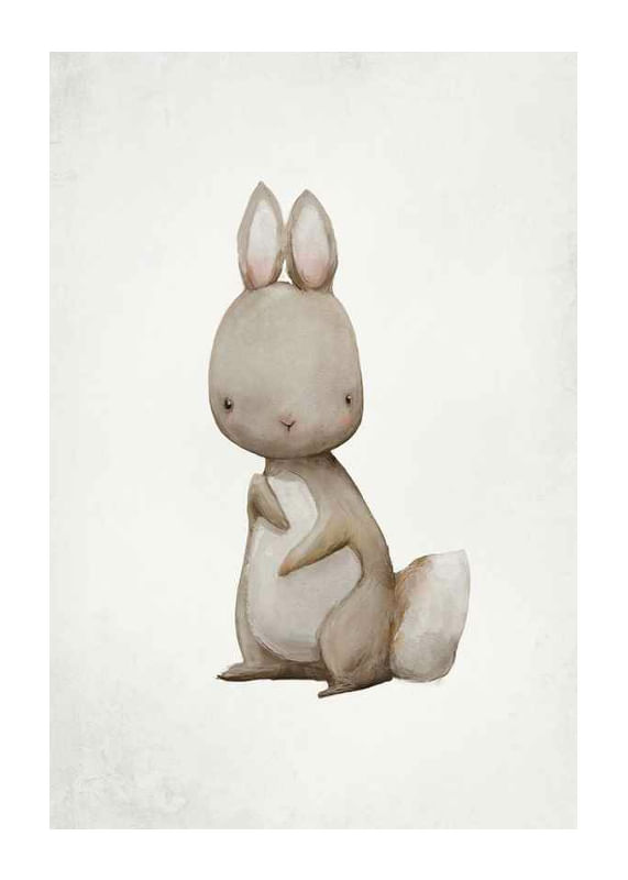 A calm hare in soft beige and grey shades stands upright against a light, lightly textured background. The large ears and simple shapes give a friendly expression that is suitable for a children's room or playroom. This poster is part of a series with animal motifs and adds a warm, playful feel to the younger environments of the home.